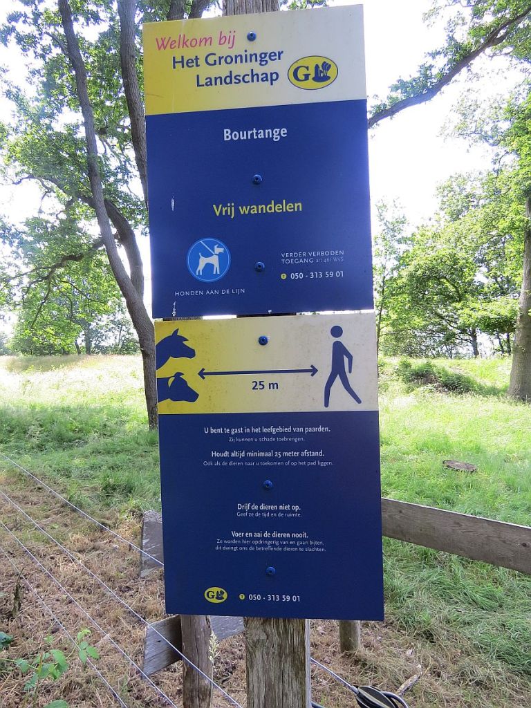 Schon sehr interessant, welche Hinweise man auf niederländischer Seite findet. Der Wanderweg geht über eine große Wiese weiter. Hoffentlich wissen auch die Kühe und Pferde, wie weit ca. 25 Meter sind. Sonst nützt dies alles nichts.