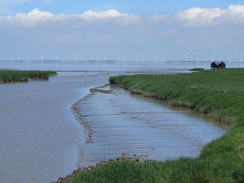 Von hier aus hat man einen wunderbaren Überblick auf den Dollart und im Hintergrund die große Hafenstadt Emden.