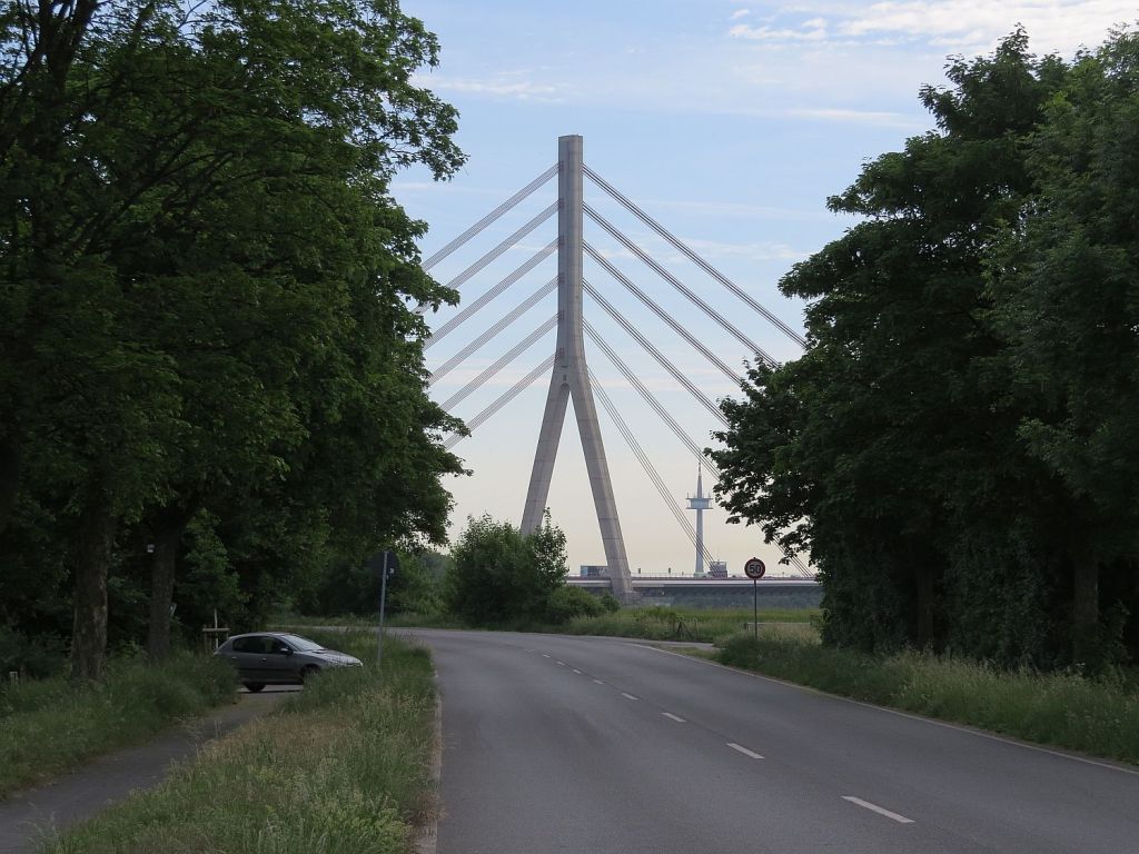 Vor Büderich hat man einen schönen Blick auf die neue Rheinbrücke. Die Straße im Bild ist die alte B58, die früher hier entlang ging und zur mittlerweile abgerissenen alten Rheinbrücke führte. Auf der bin ich früher noch gelegentlich drauf unterwegs gewesen.