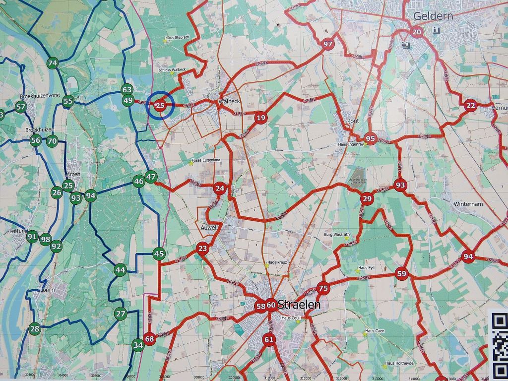 Nach einer -wie immer- guten Nacht im Schloss Walbeck !! und einem kräftigen Frühstück ging es gegen 09:00 Uhr los. Hin und wieder nutze ich für meine Planung der Strecken ein Knotensystem, das es hier rechts und links der Grenze gibt. So ist es ganz einfach sich eine Strecke/Runde herauszusuchen. In der Natur sind immer Schilder (auch hier auf NL Seite besser) mit der entsprechenden Nummer an markanten Punkten.