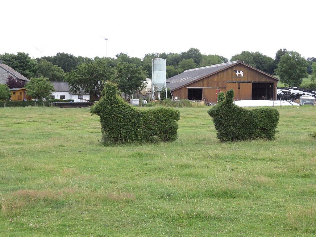 Auf der einen Seite Kornelimünster und auf der anderen Seite Hecken als Tierfiguren.