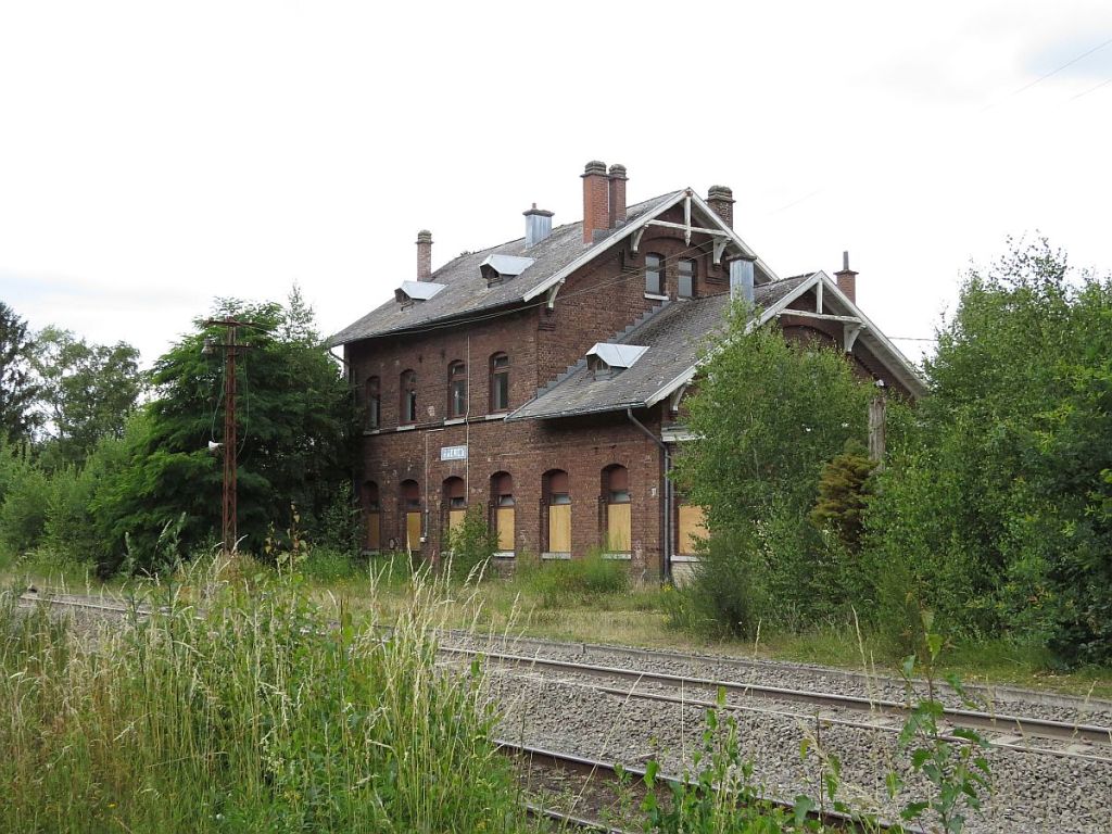 Vorbei an alten Gebäuden der Bahnstrecke erreichte ich den alten Bahnhof von Raeren (Belgien).