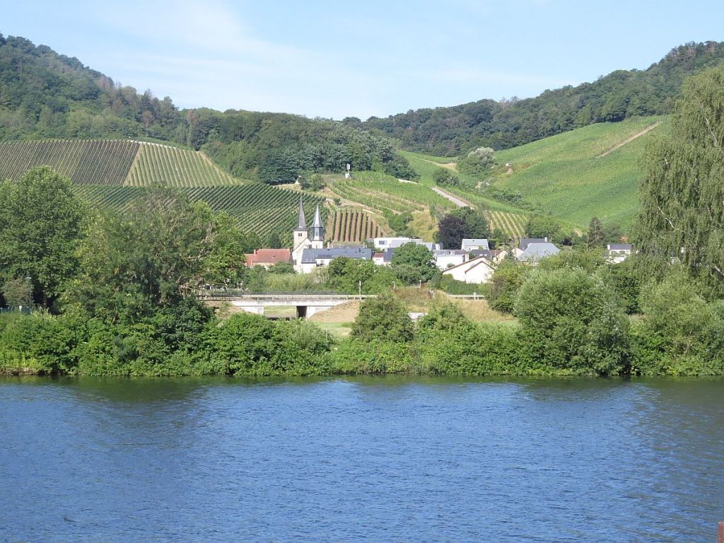 Am Ende des Naturschutzgebietes wird Sand abgebaggert und auf der luxemburgischen Seite sieht man nette Ort mit Weinbergen.