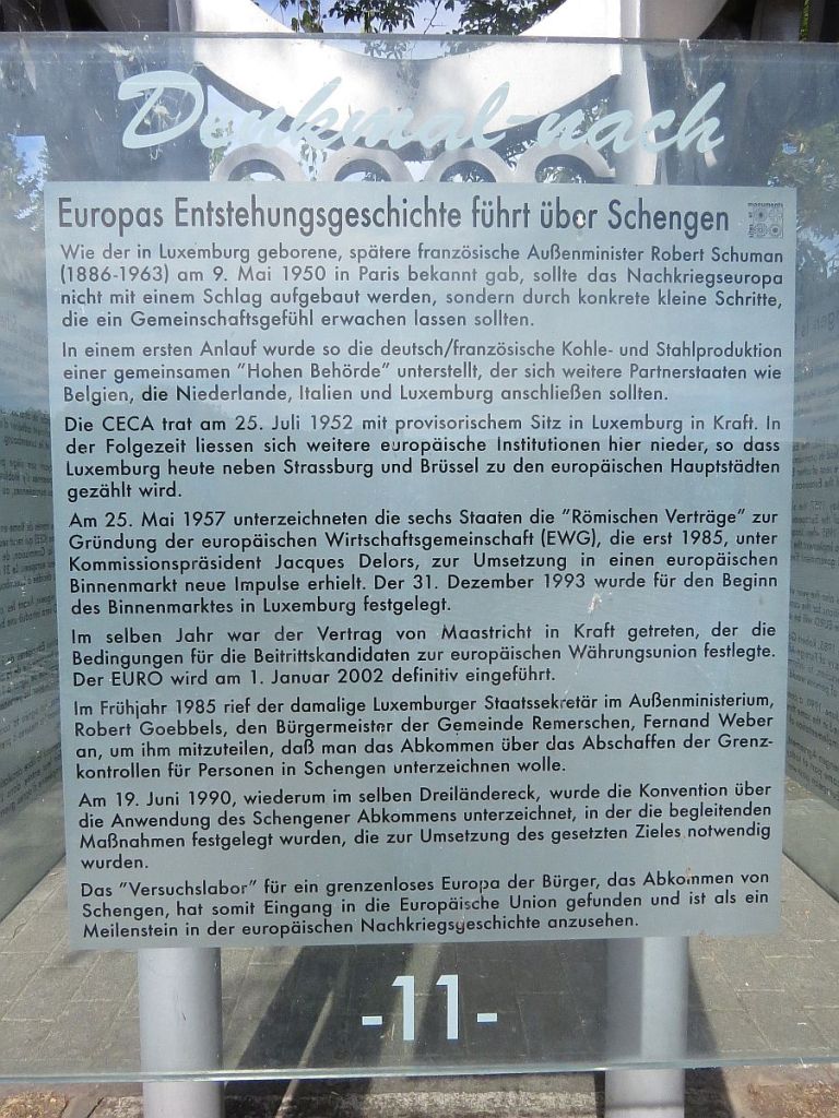 Heute sollten wieder so einige Höhenmeter, ca. 500 m, bewältigt werden müssen. Aber zuerst ging es an der Mosel bis nach Schengen zum nächsten Dreiländereck. Hier treffen Luxemburg – Frankreich – Deutschland zusammen. Auch wurden hier so einige Europäische Verträge unterzeichnet. Also eine historische Stätte.