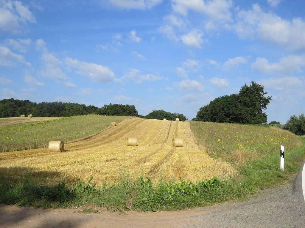 Bunte Wiesen und Kornfelder – wenn auch schon geerntet – wechseln sich ab.