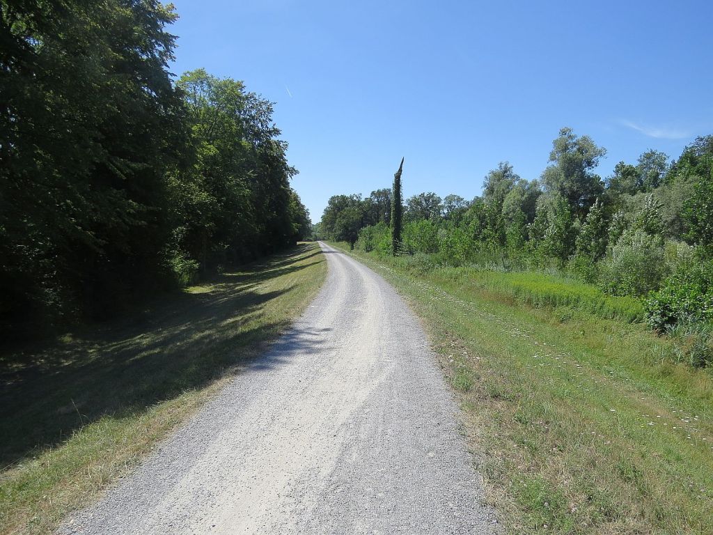 … auf sandiger Piste und an alten Rheinarmen vorbei zur Staustufe Iffezheim.