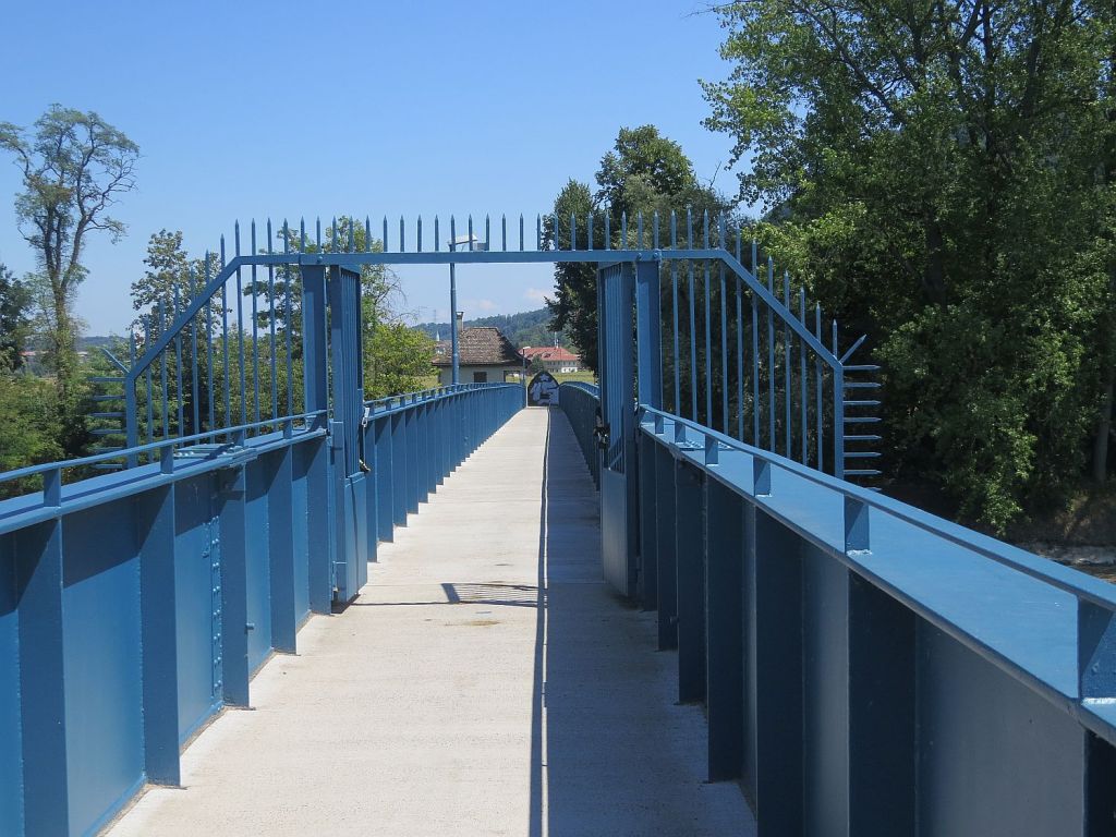 Hinter Albbrück wird der Rhein wieder angestaut und es gibt eine schmale Fußgängerbrücke nach Schwaderloch. Mitten auf der Brücke gibt es ein Tor – das allerdings jederzeit geschlossen werden kann. Nur wer hat den Schlüssel?