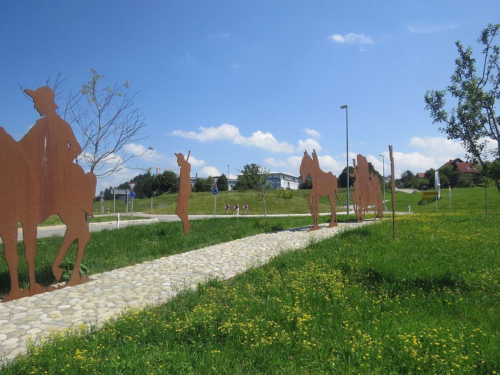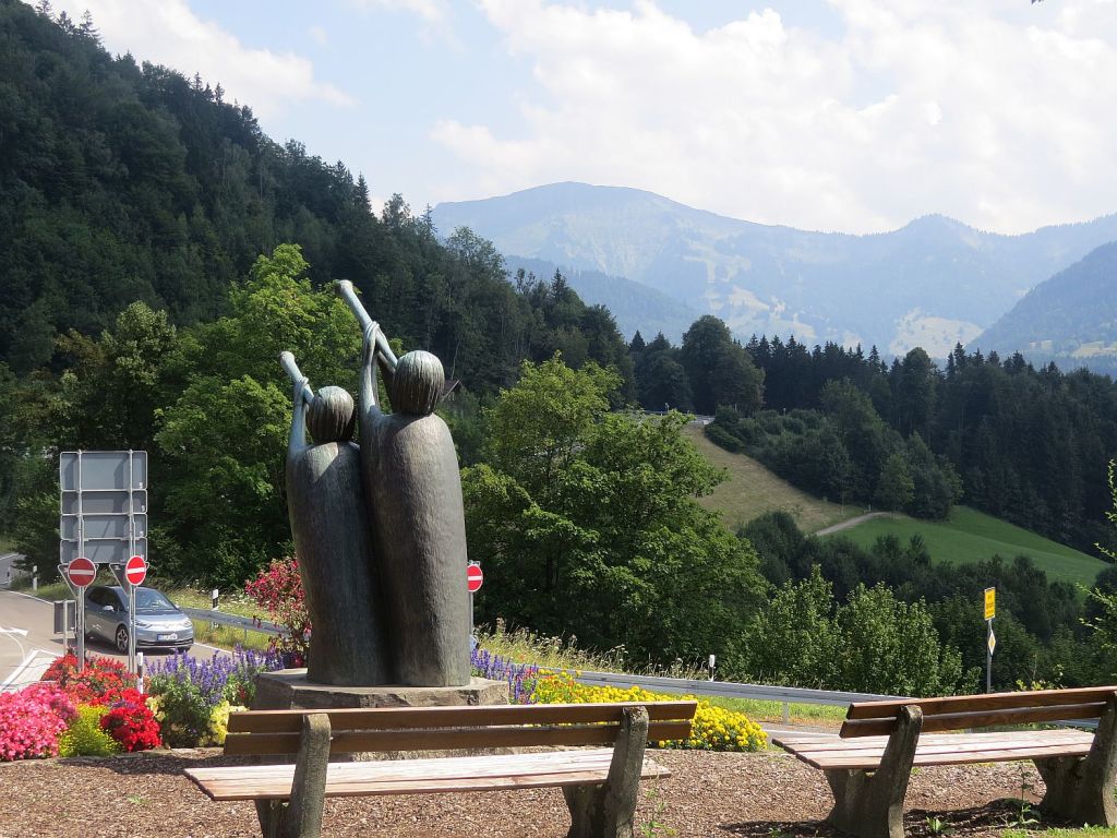 Fast in der Ortschaft Simmerberg angekommen, aber noch nicht oben, stehen im Kreisverkehr Skulpturen.