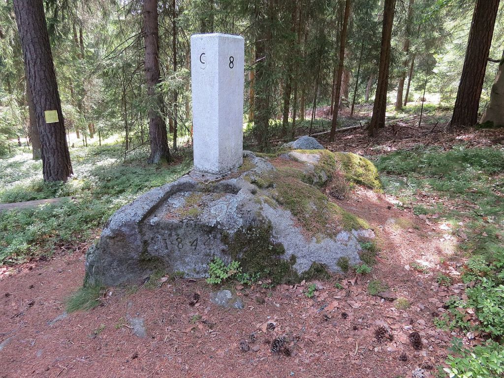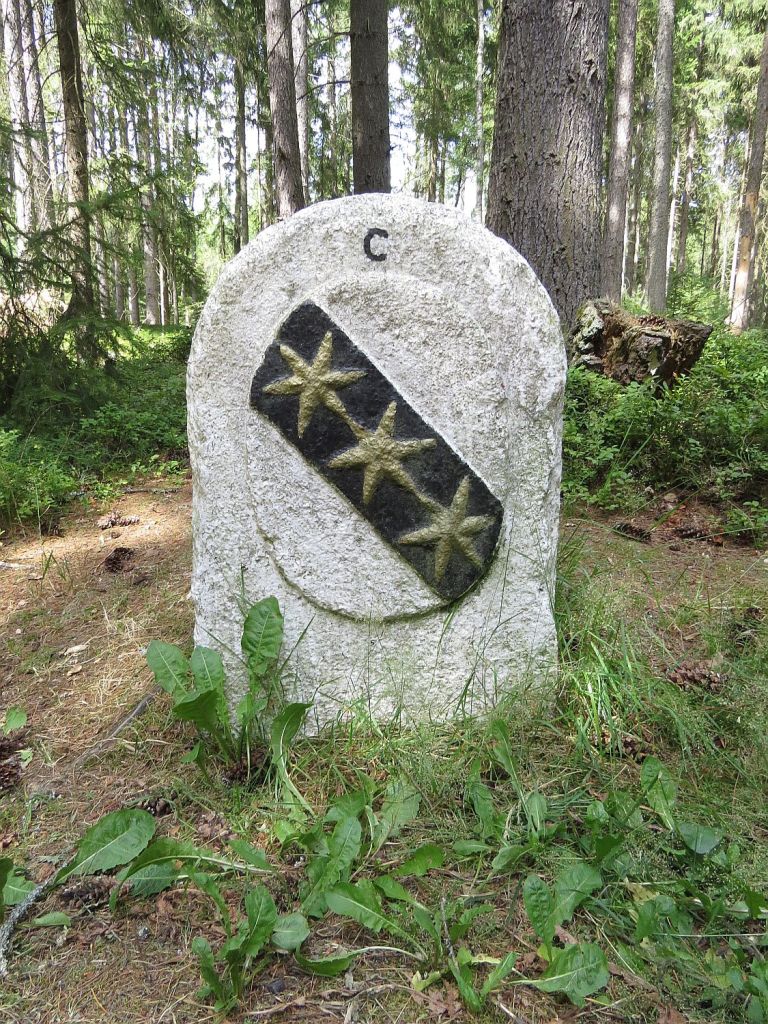 Etwas weiter im Wald ein alter Grenzstein von 1844. Heute dekoriert mit einem neuen.
