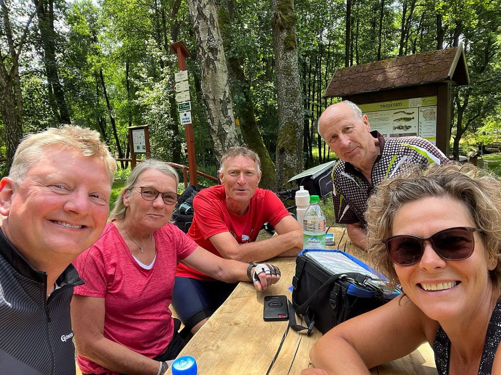 Als ich dort ankam machte eine Familie aus der CSSR dort auch gerade Pause. Wir konnten uns etwas in Englisch unterhalten und zum Schluss wünschten sie mir eine gute Fahrt. Dann kam noch ein Herr aus München kurz zum Gespräch sowie anschließend ein Radfahrer auf Tagestour mit dem ich mich auch sehr lange unterhalten habe. Und es hörte nicht auf – sondern wurde durchaus immer besser. Cat und Per aus DK waren den innerdeutschen Radweg ab Bad Harzburg gefahren und konnten viel erzählen. Wenig später tauchten Rainer und Sabine, die beiden mit ’normalen‘ Rädern, auf. Cat und Per kannten die beiden schon. Rainer und Sabine sind den ersten Teil von Lübeck im letzten Jahr gefahren und sind
