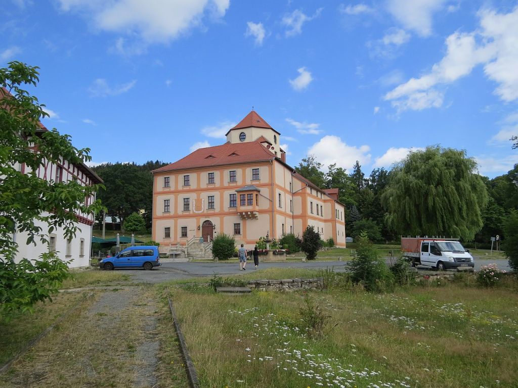 Am Freilichtmuseum des Vogtlandes vorbei ging es über Sohl zurück nach Bad Elster. Zur Stärkung und weil Sonntag war, gab es Kuchen und eine heiße Schokolade. Morgen steht nur eine kurze Etappe nach Klingenthal an. Dann aber wieder mit Gepäck. Beim Abstellen des Rades machten die beiden Inhaber gerade eine Pause. Auch hier wieder ein kurzes Gespräch. Das Hotel gehörte ihren Eltern. Zwischendurch zwangsenteignet durch den Staat, führen die beiden dies jetzt schon einige Jahre. Als Putin noch beim Geheimdienst war, hat er in einem Nebengebäude des Hotels gewohnt. Bad Elster war Garnisonstation der russischen Armee und dadurch ergab sich der Aufenthalt dieses Herren hier.