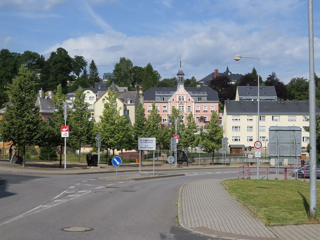 Am ehemaligen Grenzkontrollpunkt hatte ich, dass Rathaus von Bärenstein im Blick.