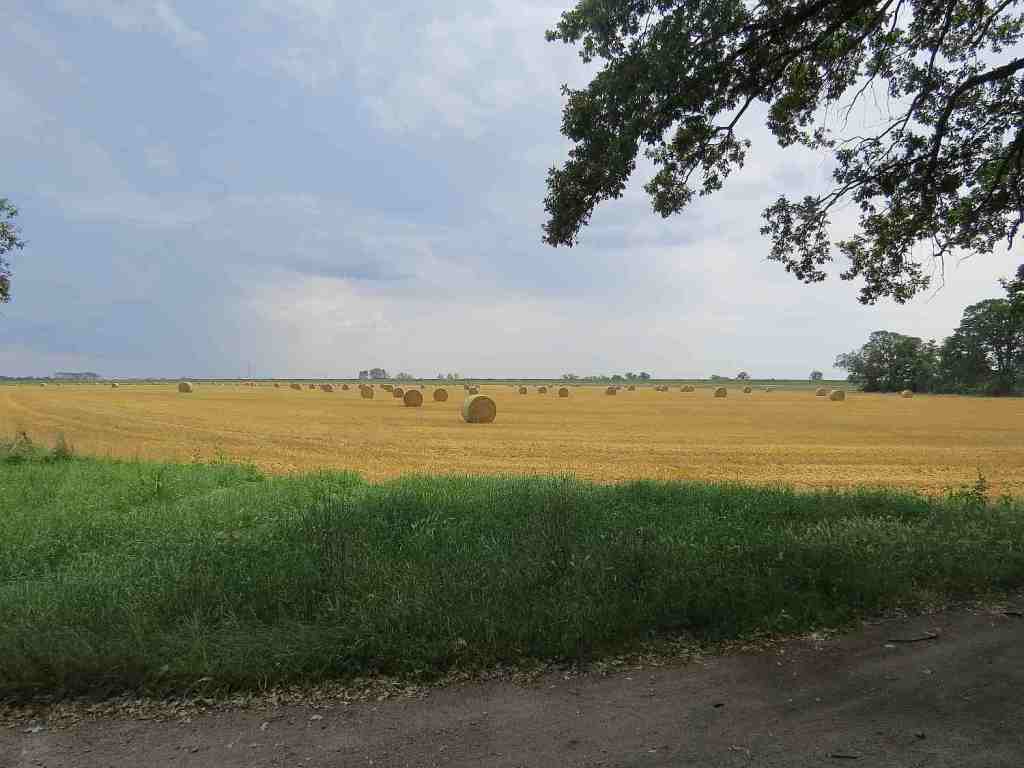 Nicht, dass hier schon mit der Ernte begonnen wird. Nein – das Stroh liegt schon zu Ballen gepresst auf dem Feld.