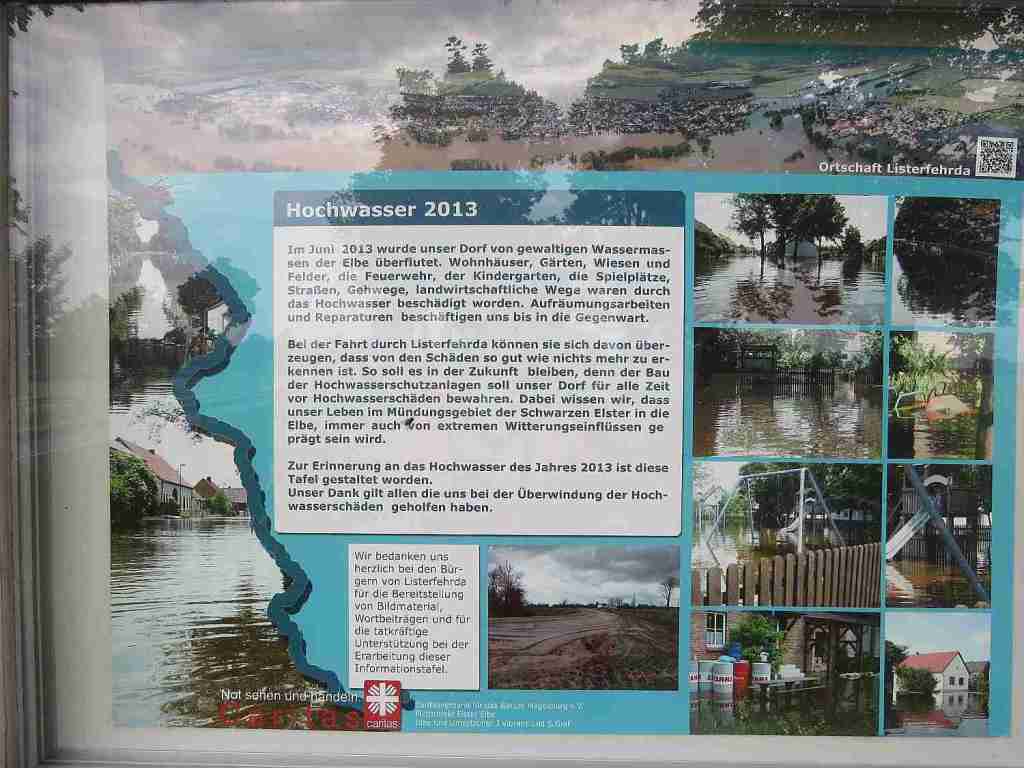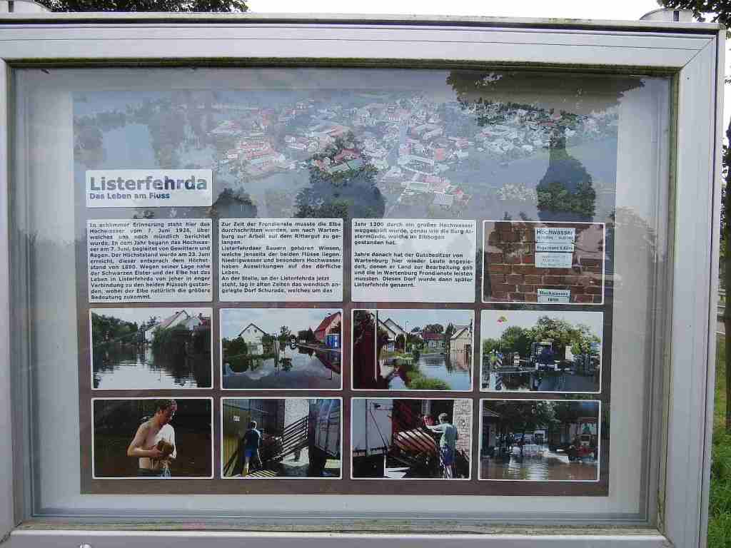 Kurz vor Elster mündet die „Schwarze Elster“ in die Elbe. Auch hier gab es gewaltige Hochwasser von Elbe und Elster, wie ich am Ortseingang von Listerfehrda sehen durfte.