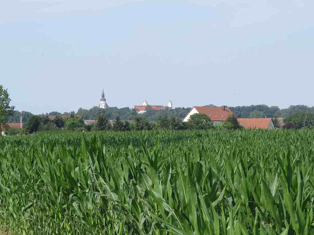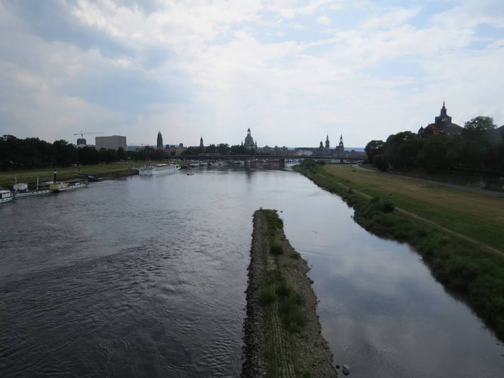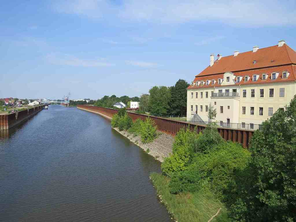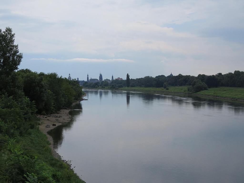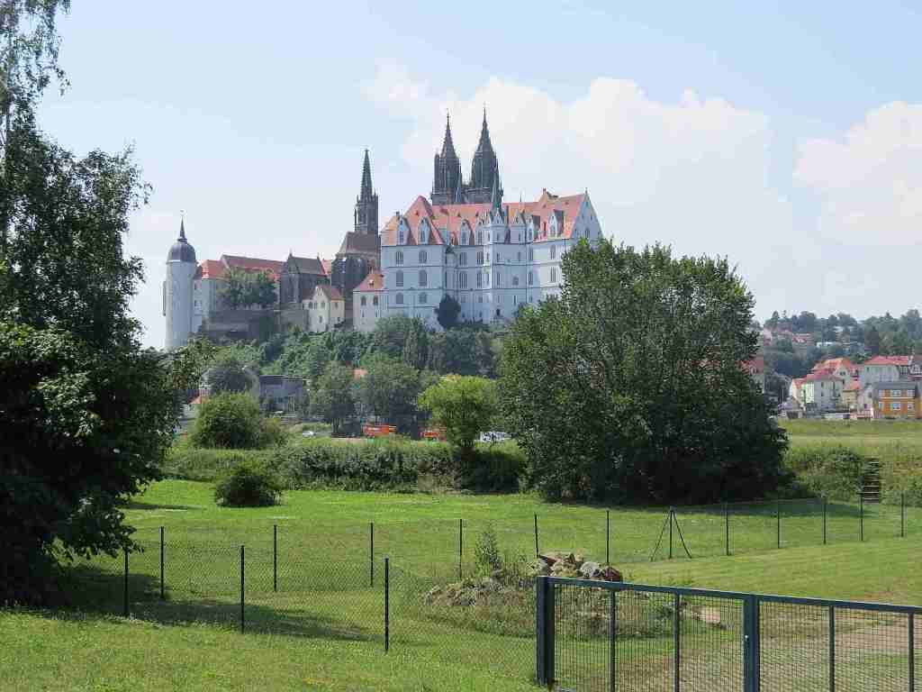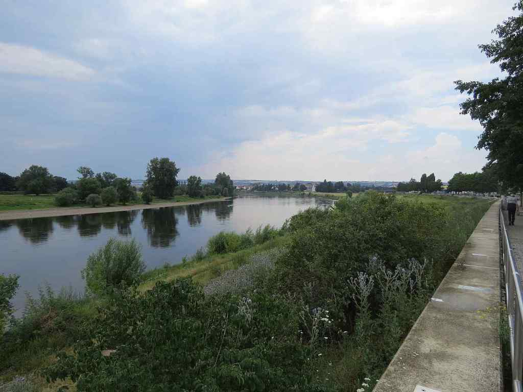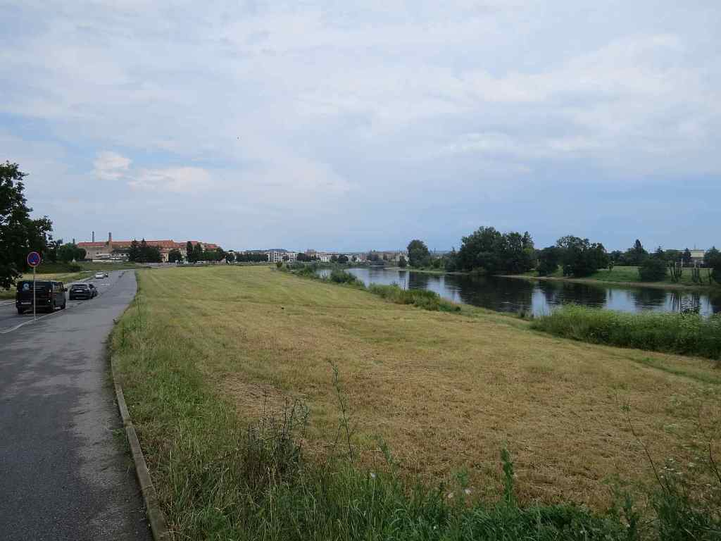 Wärme und Gegenwind waren auch heute meine Begleiter von Mühlberg nach Dresden. Nach einemguten Frühstück im Garten der Pension machte ich mich schon kurz nach 08:00 Uhr auf den Weg. Wie jeden Morgen suche ich zum Start ein Fotomotiv. Heute ist es der Rückblick auf Mühlberg.