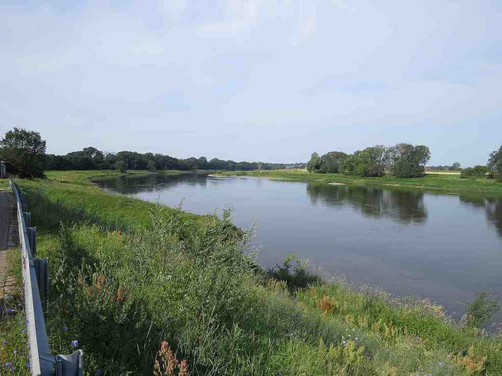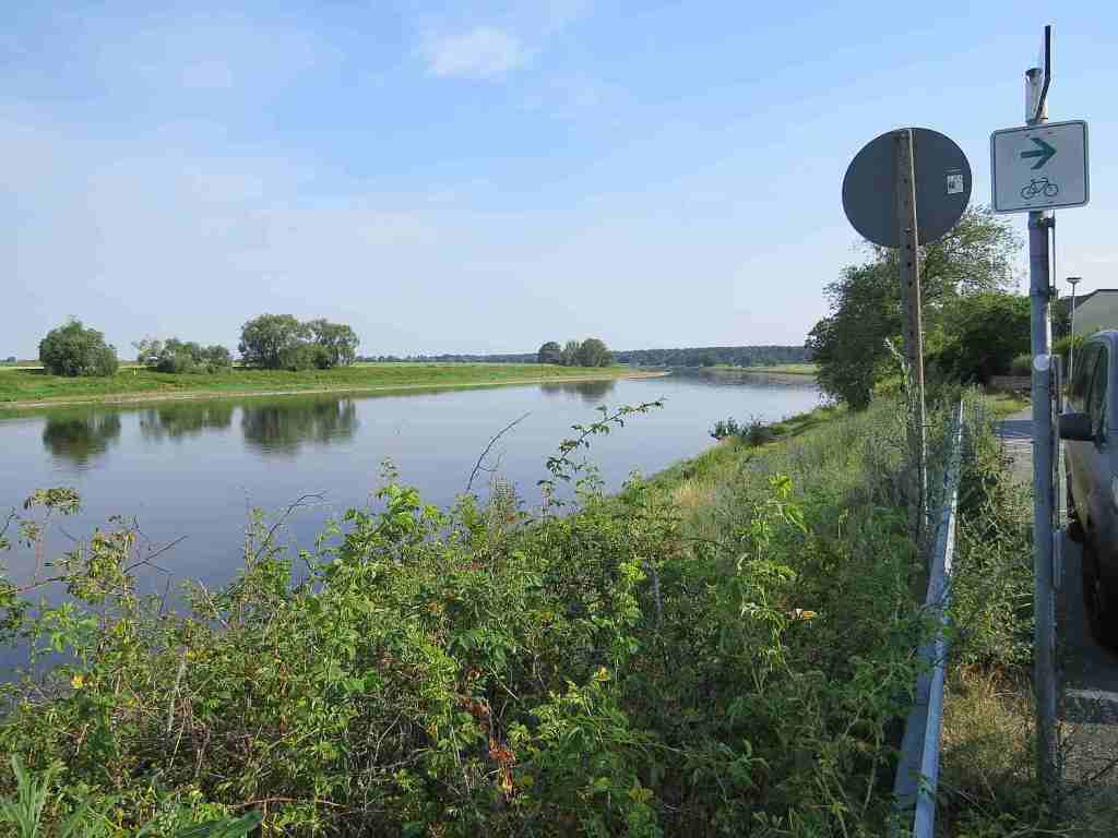 In der Ortschaft Kreinitz hielt ich an, um zwei Bilder der Elbe zu machen. Da meine Bremsen etwas quietschen, sagte eine Frau, die sich dort mit einer andern unterhielt, dass Fahrrad noch nicht bezahlt ist! Dadurch ergab sich dann ein nettes Gespräch über meine Reise und die Situationen der verschiedenen Hochwasser der Elbe. Das Hauptproblem im Ort ist immer das Hochdrücken des Grundwassers. Die Häuser selber liegen alle hoch genug.