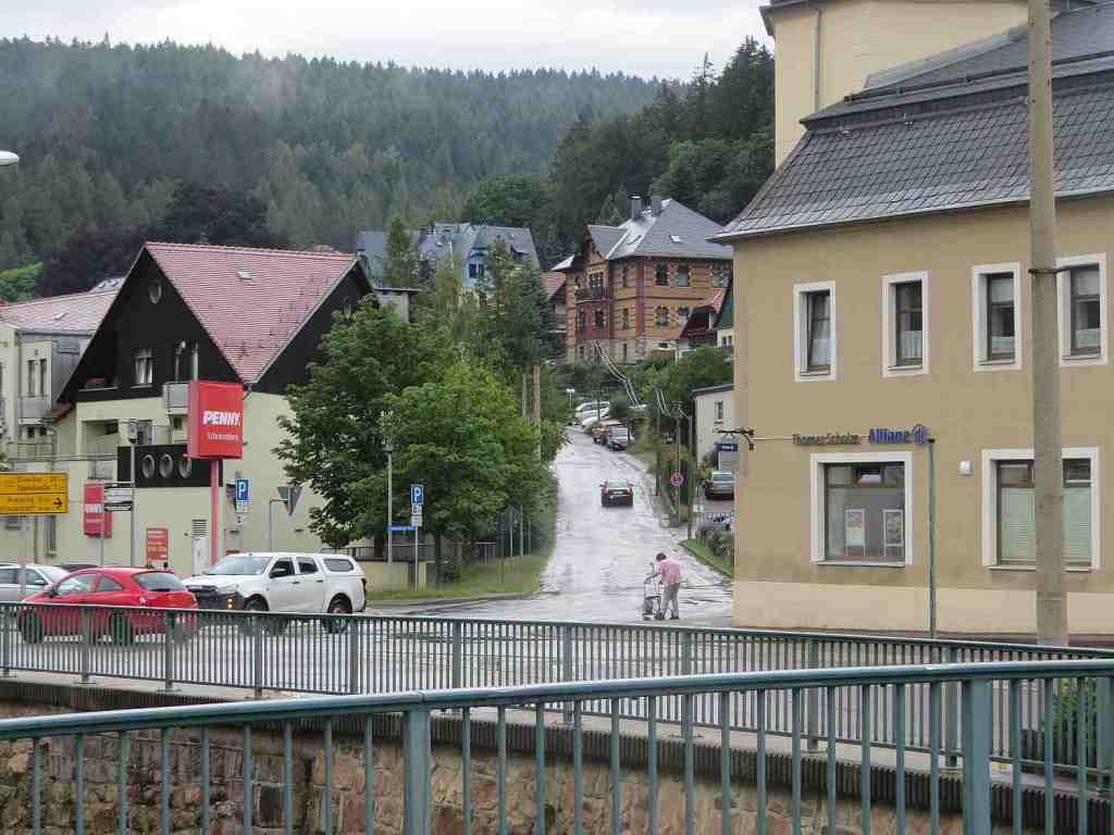Nur kurze Zeit später musste ich eine länge Zwangspause einlegen. Hinter mir war es trocken. Aber in Richtung Schmiedeberg ging es 12 % bergab und dort regneten sich die Wolken kräftig ab.