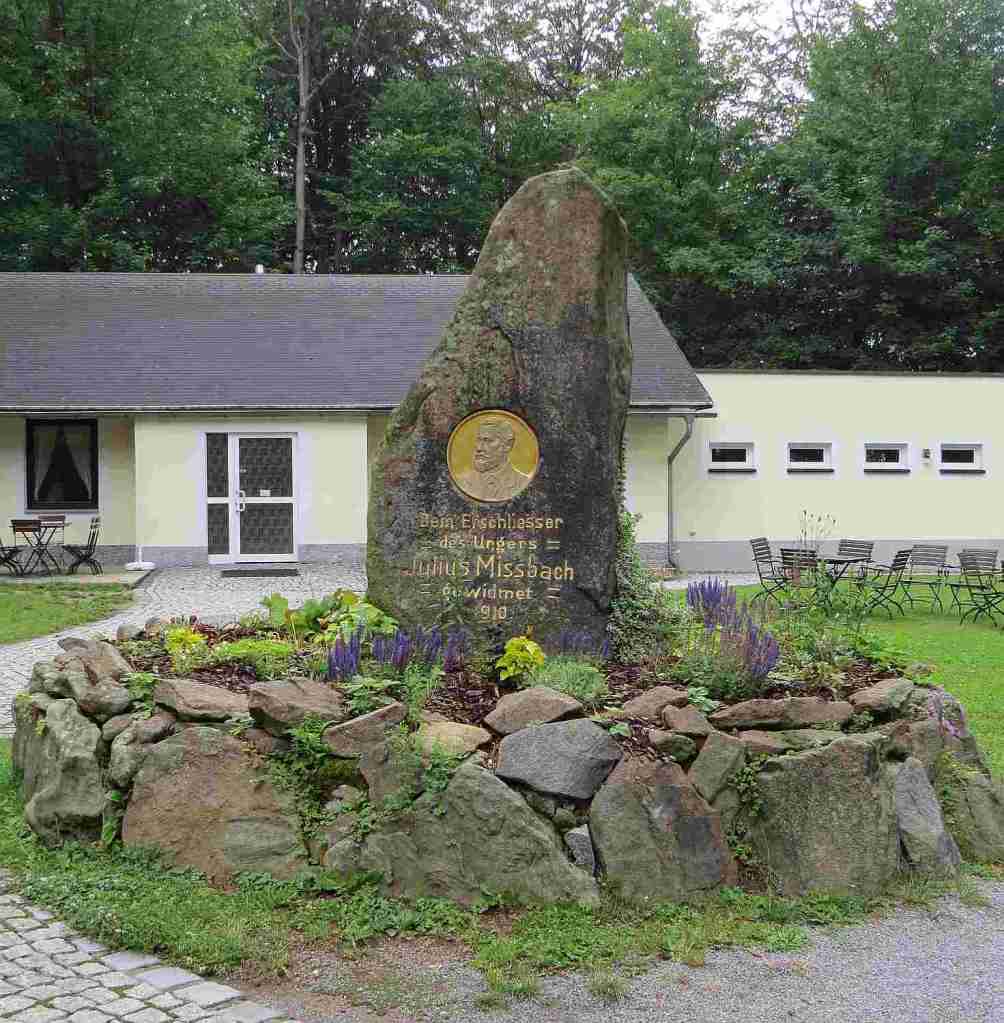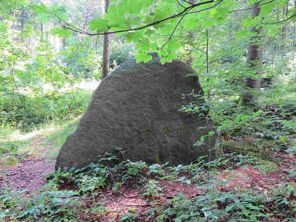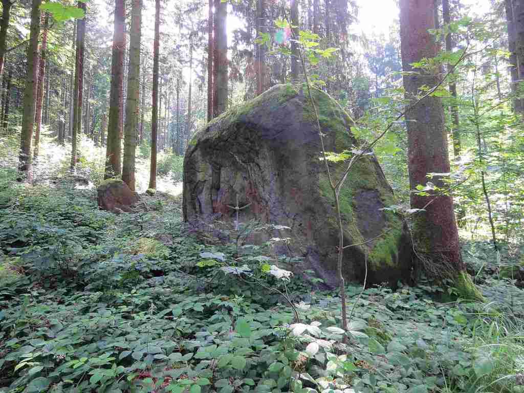 Es lagen noch diverse Steine herum – zum größten Teil aber schon zugewachsen. Auf dem nachfolgenden Schild stand folgender Text: „Zeugen hist. Steinbearbeitung“