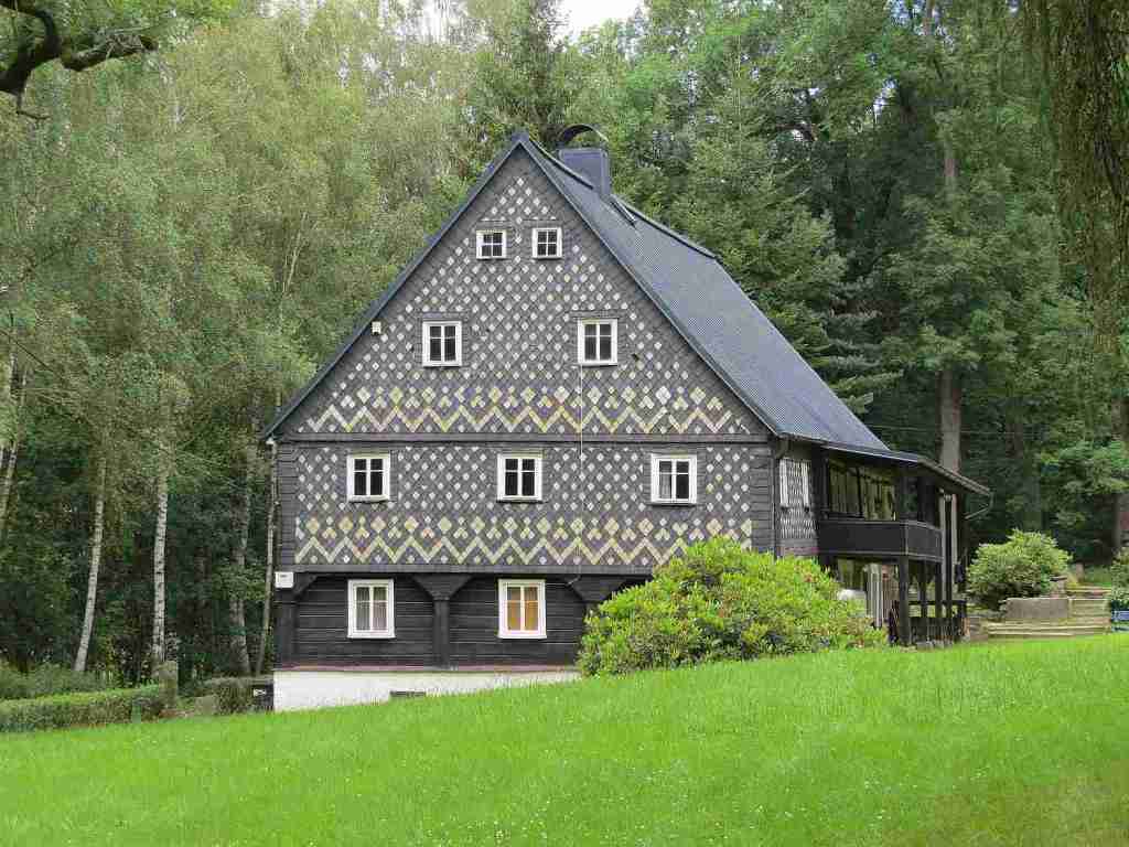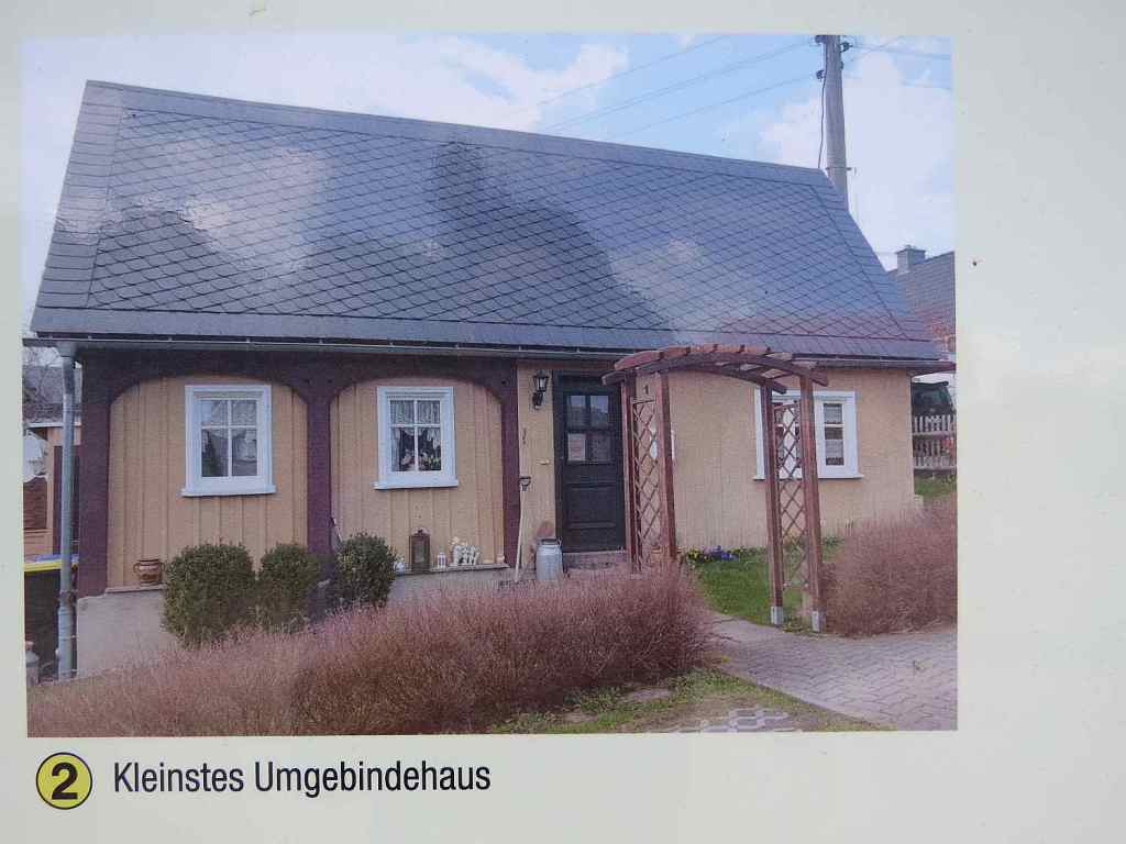 In dieser Gegend der Lausitz gibt es viele Umgebindehäuser. Ein sehr kleines steht etwas außerhalb des Ortes.