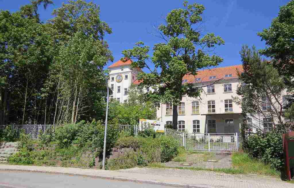 Das Gebäude war zu Zeiten der DDR eine Fabrik für Kinderkleidung. Steht jetzt aber schon sehr lange leer. Nur im oberen Turmbereich hat die frühere Besitzerin bis 2002 gewohnt. Dann ist sie verstorben.