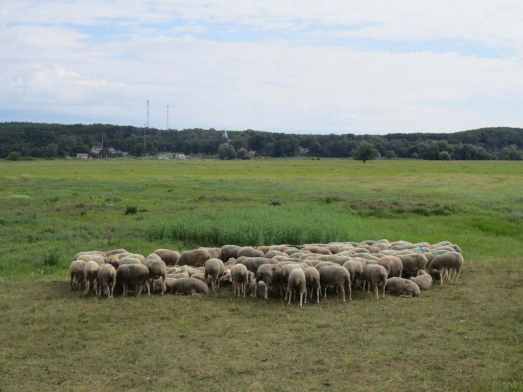 Meine Begleiter waren an diesem Morgen nur die vielen Vögel, Störche am Horizont und die vielen Insekten. Von Radfahrern war nicht viel zu sehen. Die Schafherde war noch sehr eng beisammen.