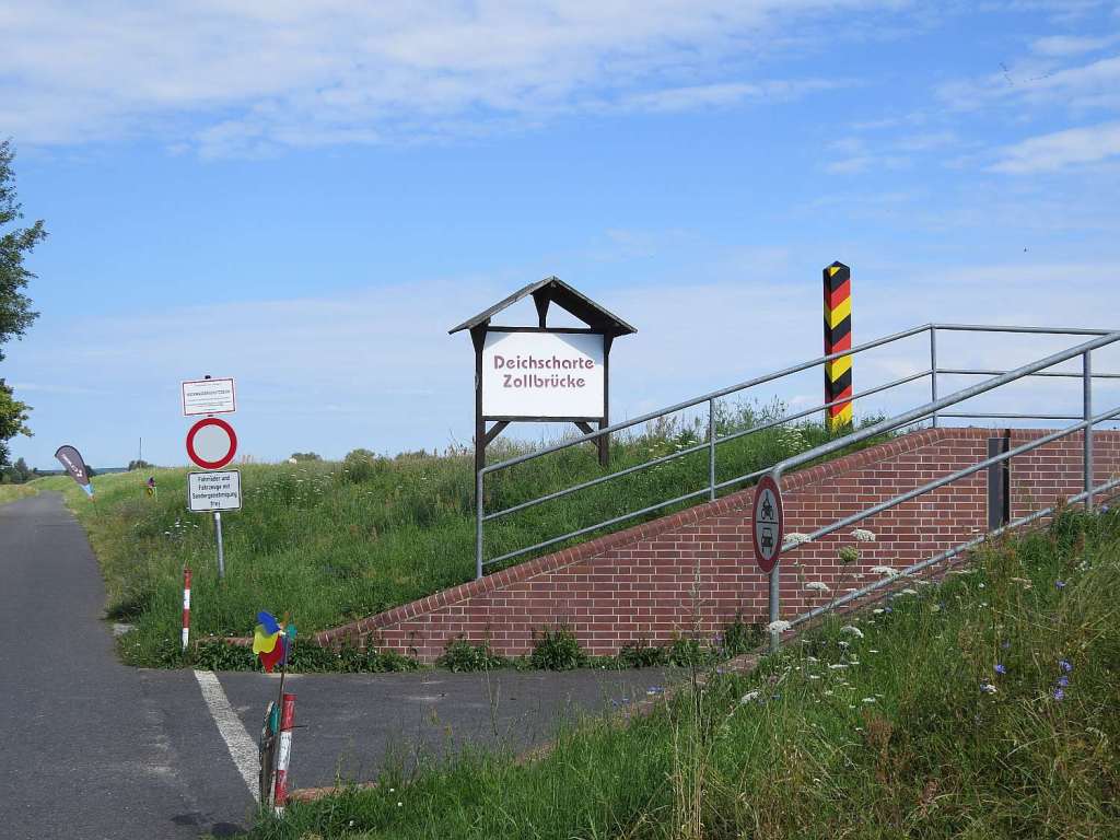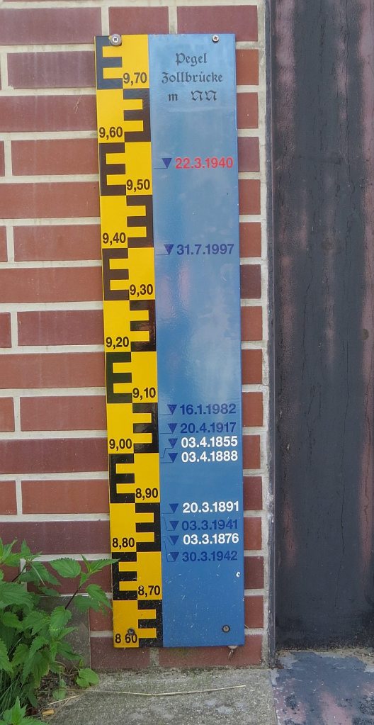 Bei Zollbrücke gibt es einen Deichdurchlass mit Angabe der Fluthöhen.