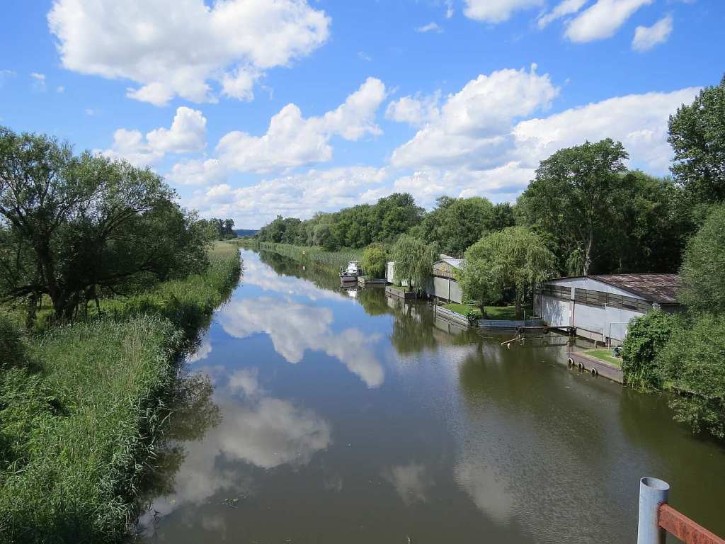 Wenig später und kurz vor der Mündung des Oder-Havel Kanals in die Oder bin ich komplett von der Grenze zu Polen für heute weggefahren. Morgen komme ich zu der Stelle wieder. Mein Ziel war das Schiffshebewerk Niederfinow. Der nicht so schöne Radweg ging parallel zum Kanal. Hier hatte ich auch die erste Begegnung mit einem größeren Schiff. Bisher hatte ich auf der Oder nur kleine Angelboote gesehen.