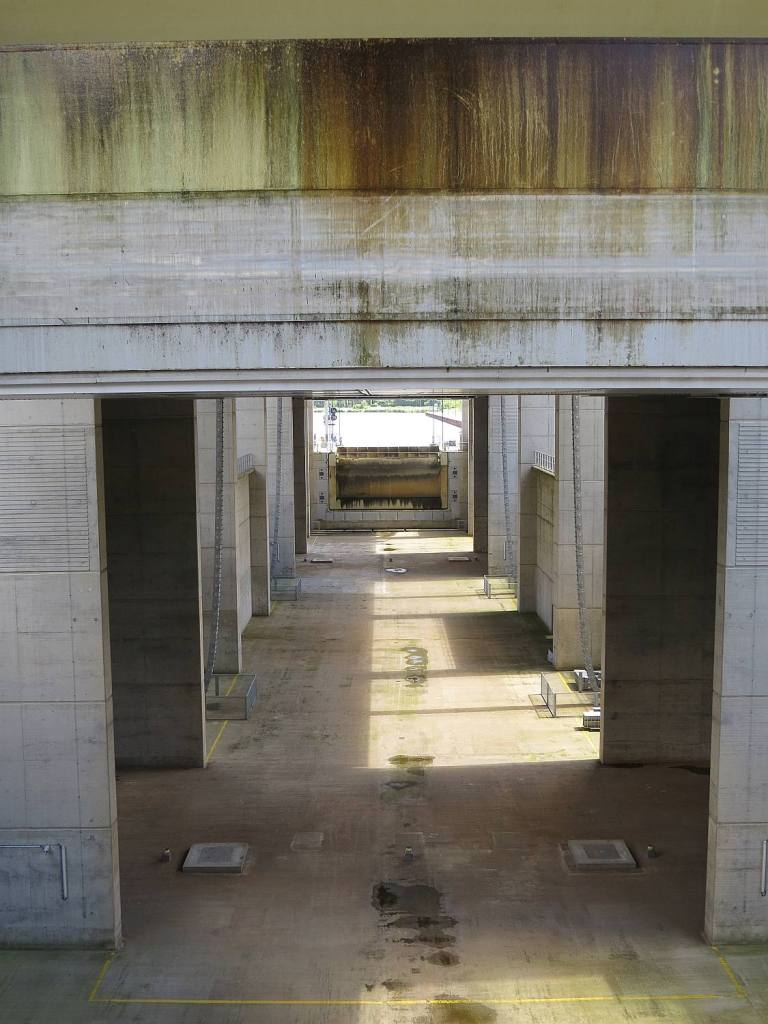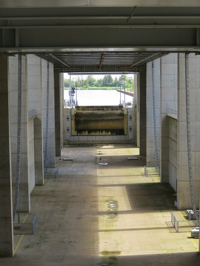 So sieht die neue Schleuse von innen aus und während des Absenkens des Troges.