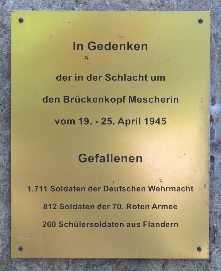 Die Wetterapp sagte, dass ich es noch bis Mescherin schaffen würde. Da plante ich dann meine Pause ein. Am Ortseingang dieser Gedenkstein mit der Info.