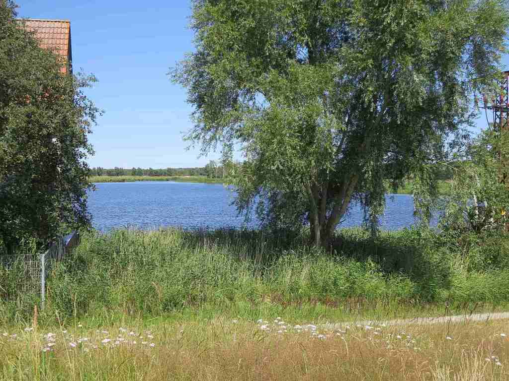Auf der einen Seite die Peene hinter ihrem Deich und auf der anderen Seite kleine Seen.