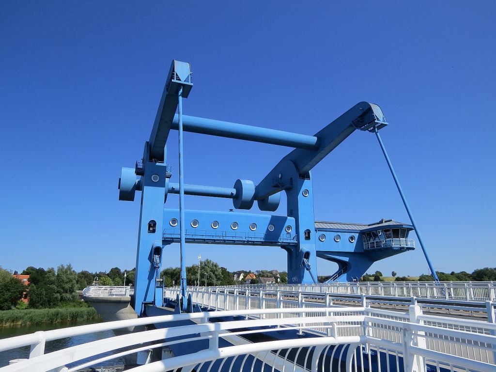 Die mächtige Klappbrücke – gebaut und gebraucht wurde diese, weil die Peenewerft landeinwärts liegt. Ich gehe davon aus, dass die Werft im Augenblick aber nicht mehr in Betrieb ist.