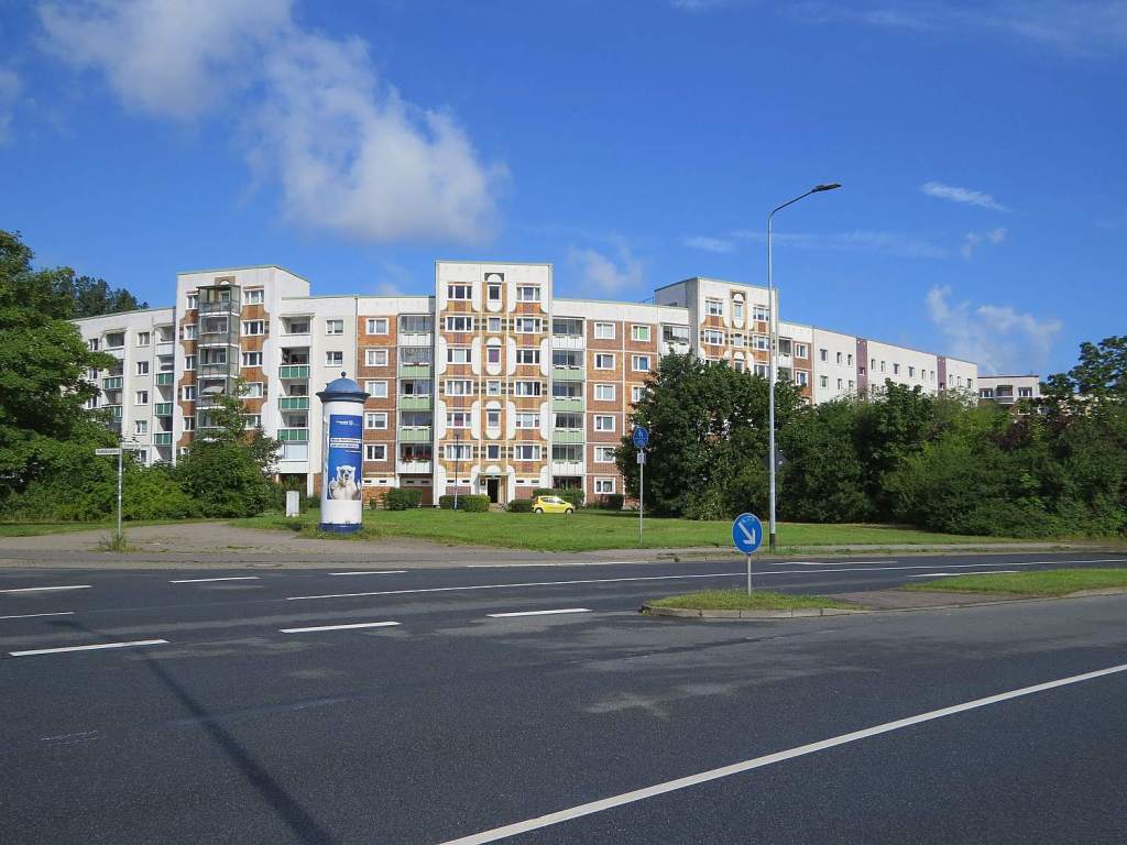 Gegen 09:30 Uhr waren die Regenwolken in Rostock verschwunden und mein Fahrradtag konnte starten. Es ging auf dem gleichen Weg wieder zurück nach Warnemünde. Die ehemaligen Plattenbauten, es sind sehr viele, wurden nett gestaltet.