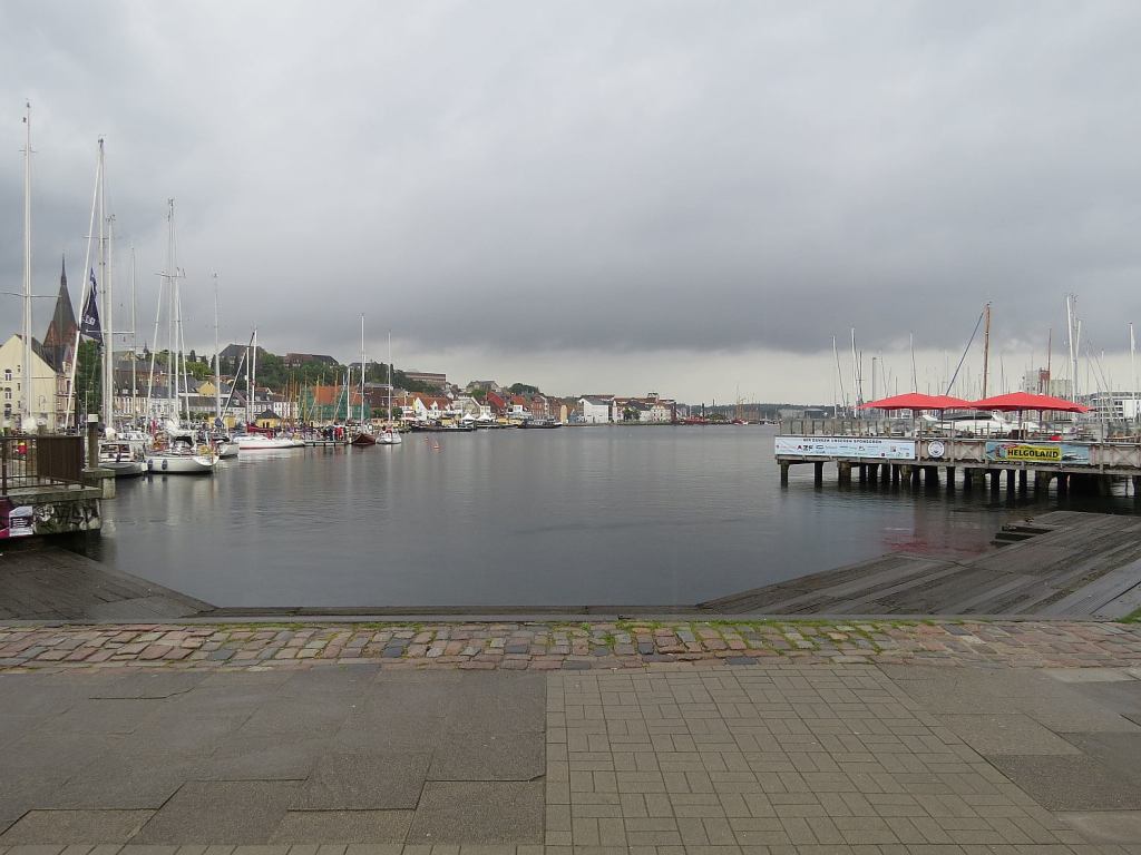 Vom Hotel ging es bergab bis zum Ende der Flensburger Förde. So wie auf den ersten Bildern sah der Himmel fast den ganzen Tag aus. Von Sonnenschein kann ich nicht berichten. Die Segelboote im Vordergrund verdecken etwas dem Museumsberg von Flensburg.