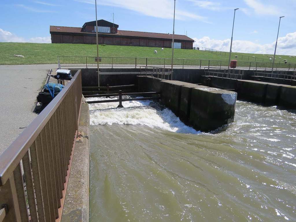 Vorbei an der Sönke-Nissen-Schleuse mit dem Speicherbecken auf der Landseite ..