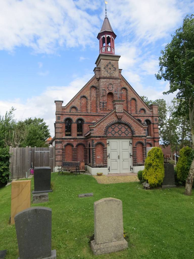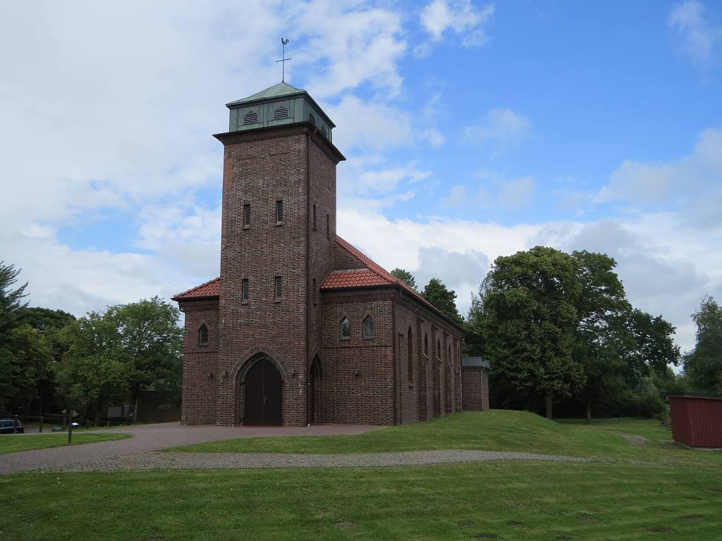Links vom Weg die Kirche Emmelsbüll-Horsbüll.