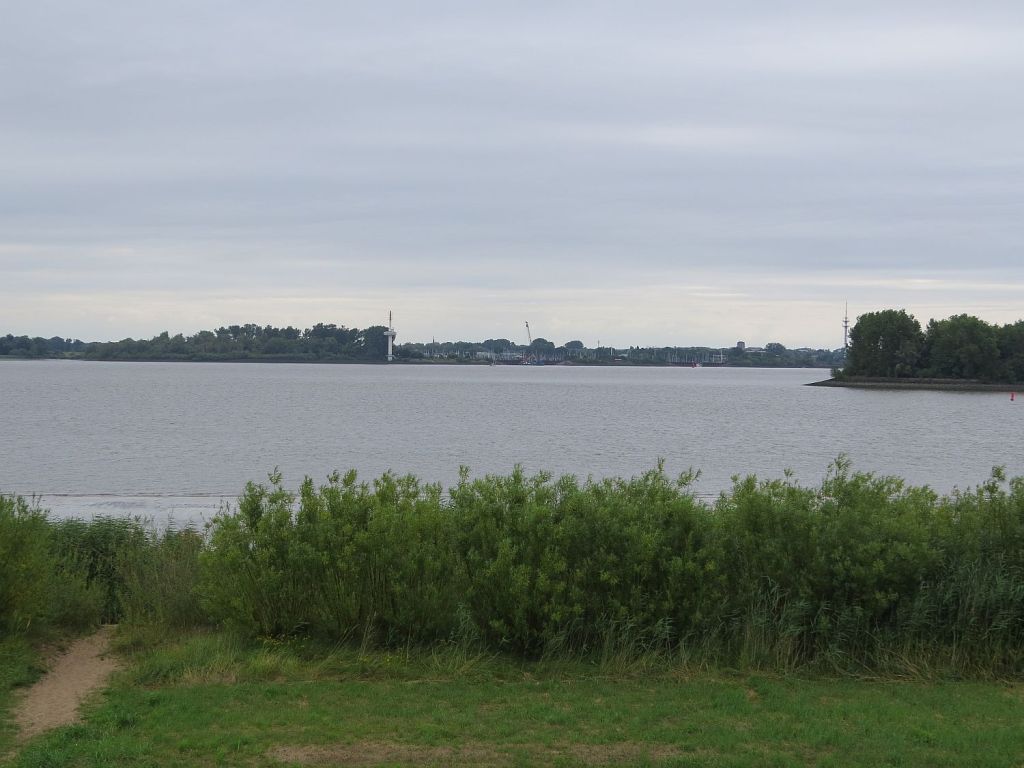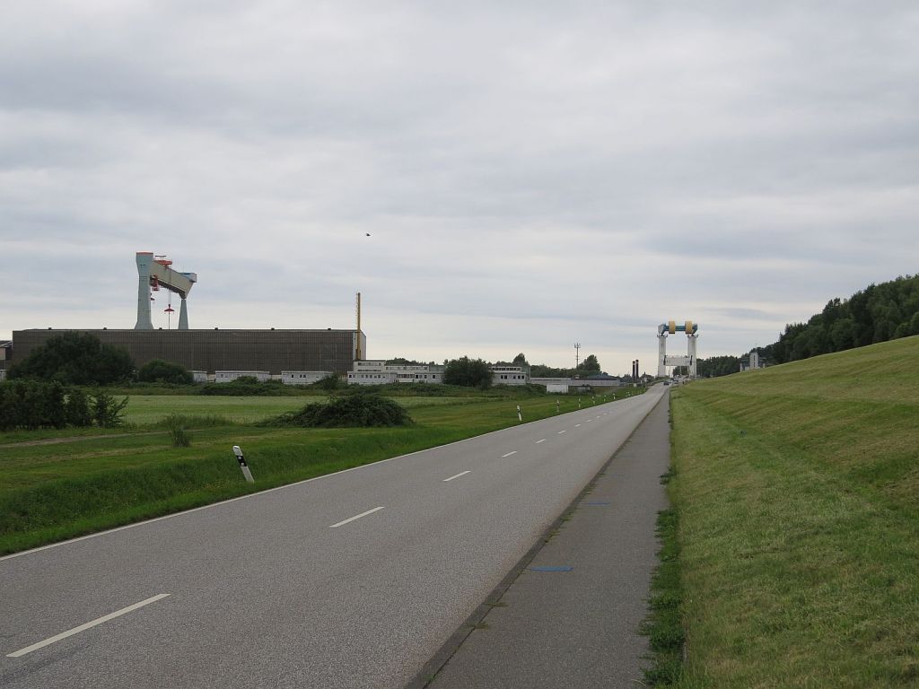 Auch hier kommen, wie in Schleswig-Holstein, aus dem Hinterland regelmäßig kleinere Flüsse, die in die Elbe münden. Der erste Fluss war die Este mit dem Este-Sperrwerk und einer riesigen Klappbrücke. Die Werft links im Bild scheint aber nicht mehr in Betrieb zu sein.