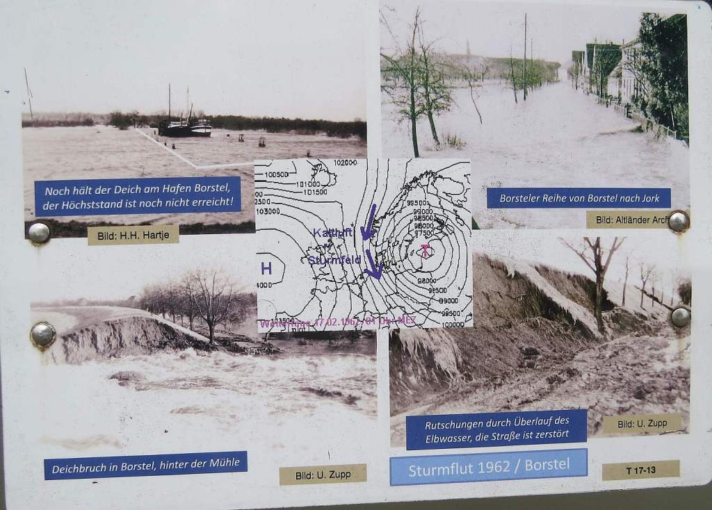 Das Alte Land ist das größte zusammenhängende Obstanbaugebiet in Deutschland. Bei der schlimmen Sturmflut 1962 wurde dieser Landstrich komplett überschwemmt. Darin erinnert dieses Wandgemälde an der Hausmauer.
