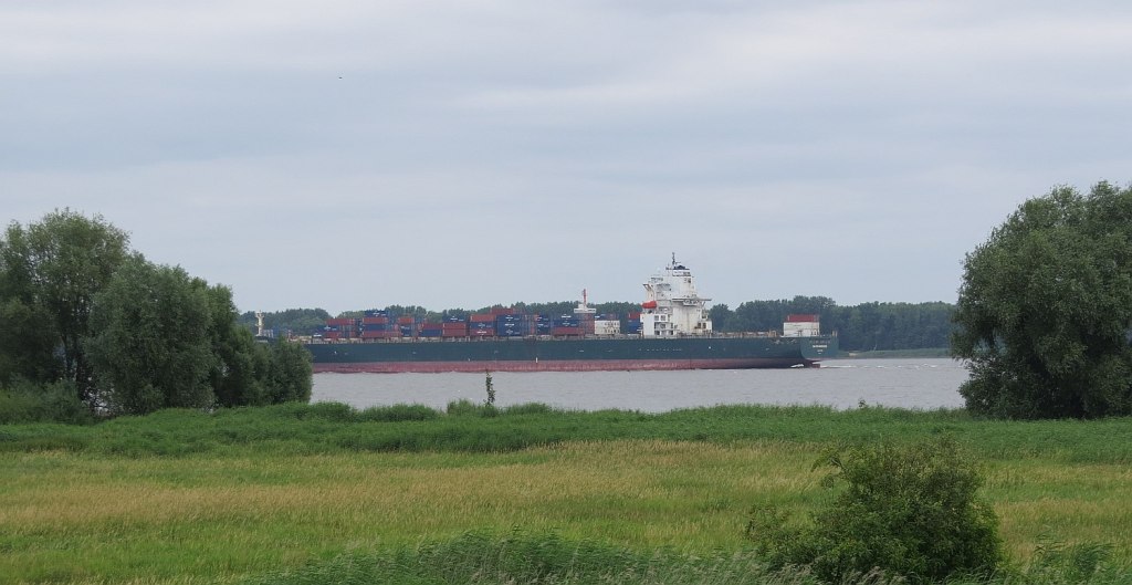 Hinter Stade kam dann doch endlich ein größeres Schiff aus Hamburg raus. Wegen der Ebbe können die großen Schiffe nicht jederzeit fahren.