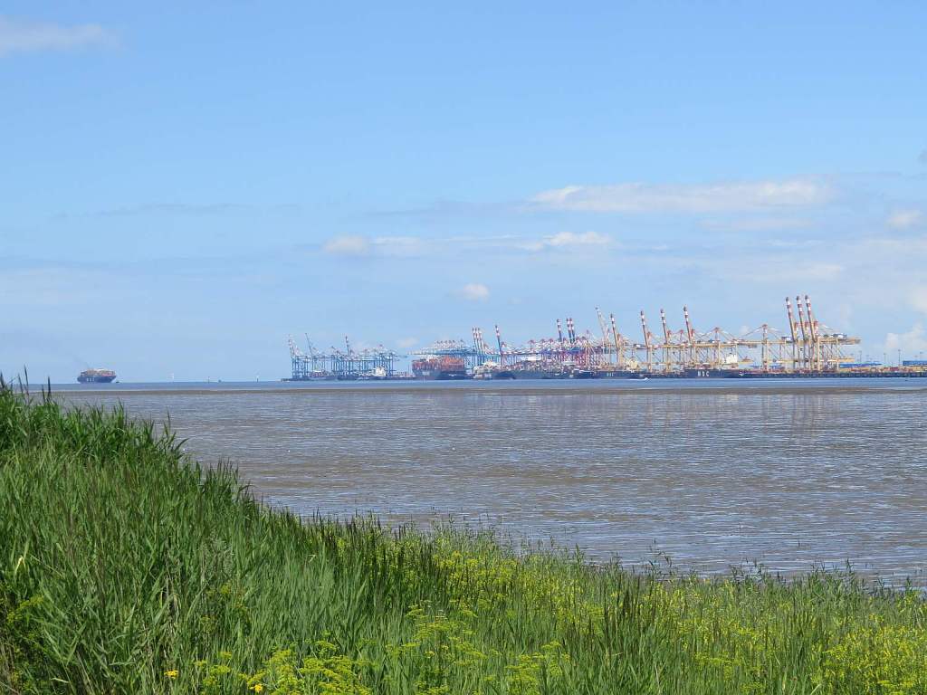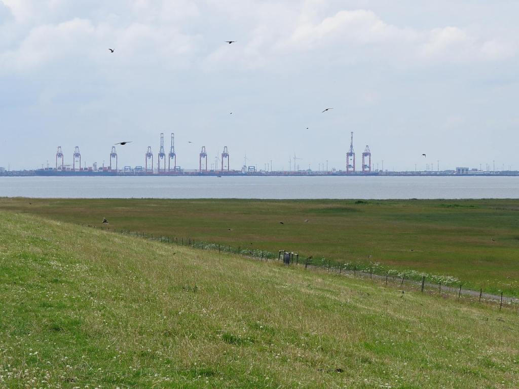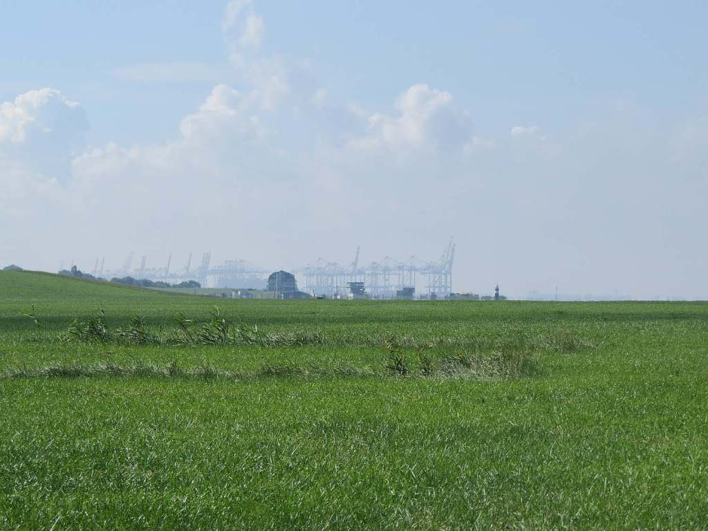 Im linken Bogen um Butjadingen herum sah ich bereits den dritten großen deutschen Containerhafen am Meer – den Jade-Weser-Port. Dort werde ich übermorgen vorbeikommen.