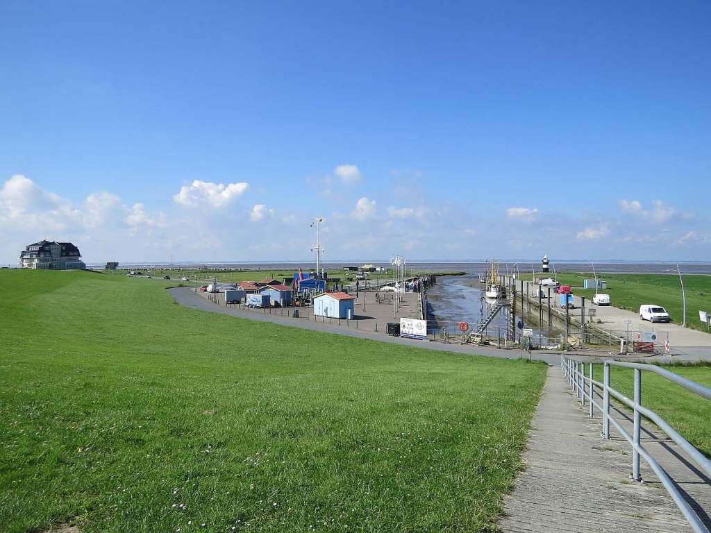 Der kleine Hafen von Wremen war aufgrund der Ebbe wasserlos. Der Leuchtturm wird „Kleiner Preuße“ genannt.
