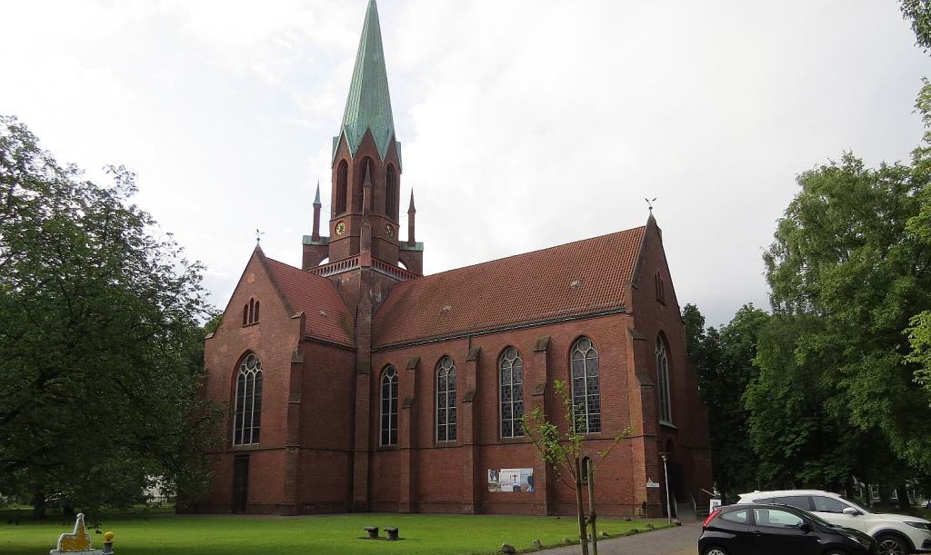 Die Kirche von Esens lässt sich schwer ins Bild setzen – sie ist von hohen Bäumen und Häusern umrahmt.