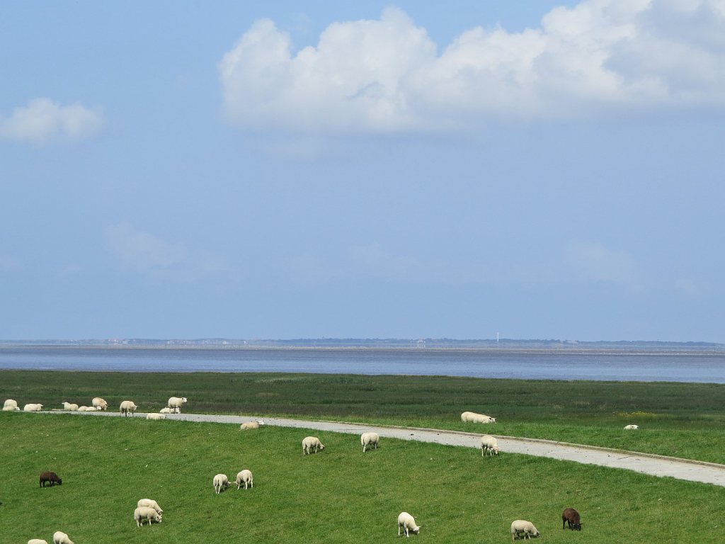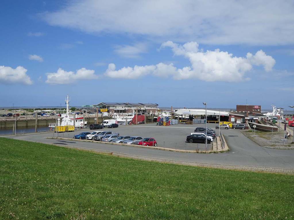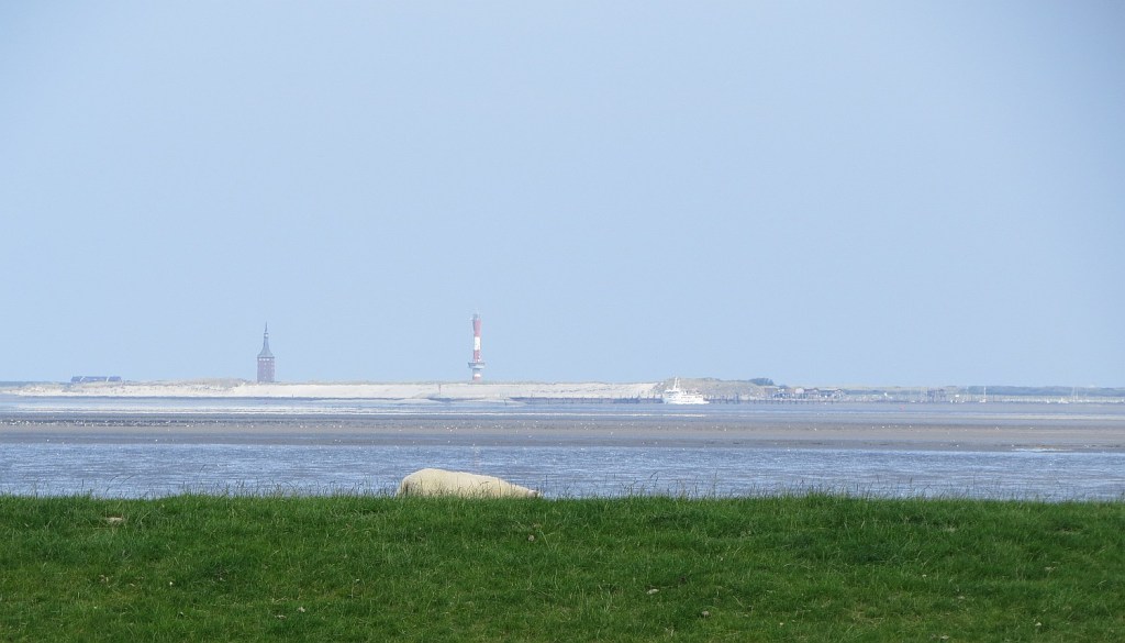 Ganz in der Ferne: der Schiffsanleger von Neßmersiel. Von dort aus fahren die Schiffe nach Baltrum.