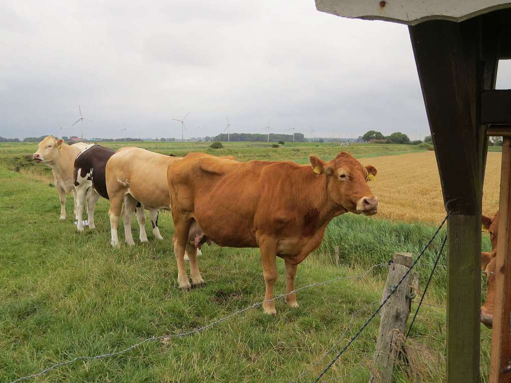 … auf den Deich hinauf gehen. Die Kühe schauen auch nicht ganz glücklich.