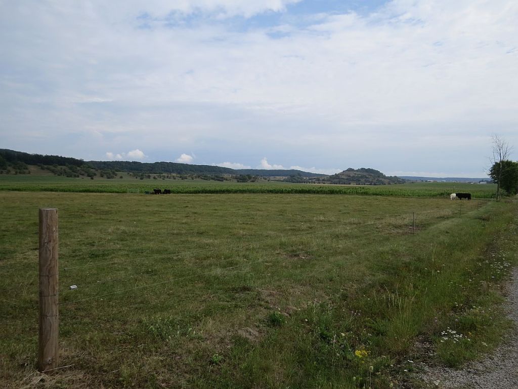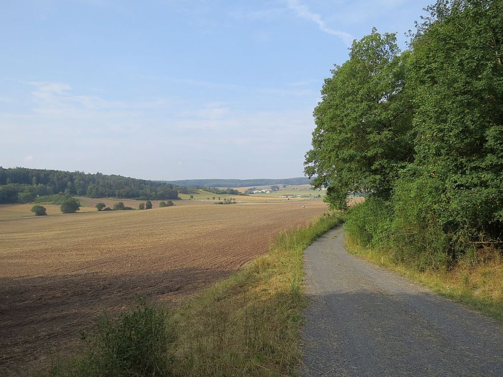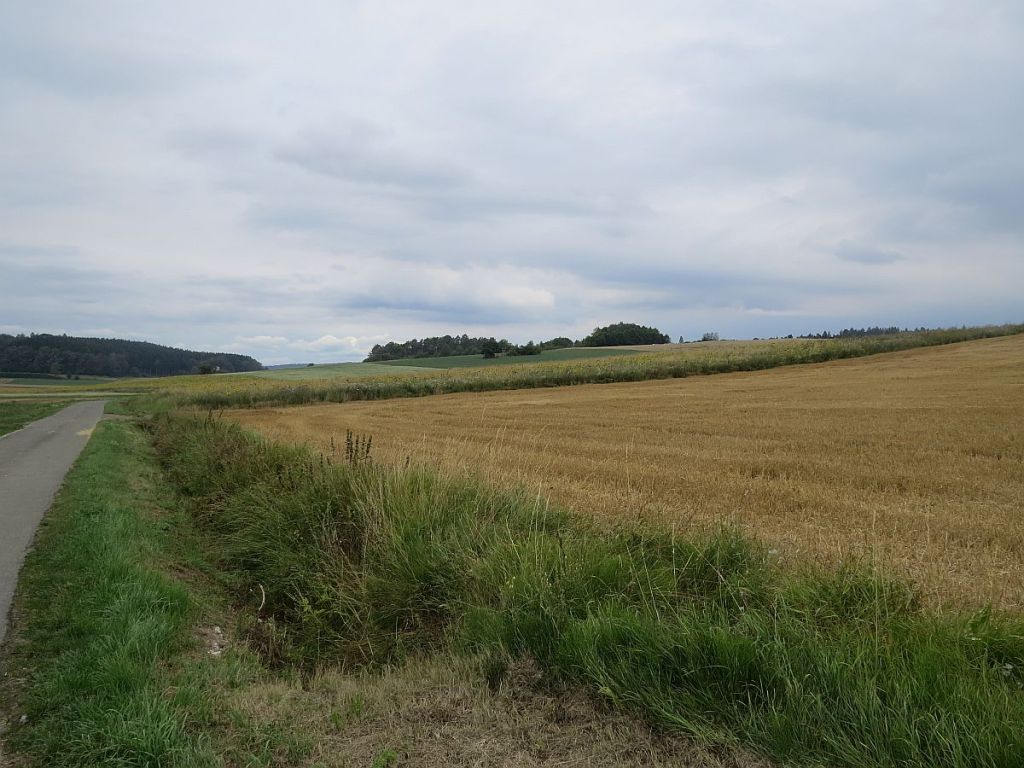 Ab Lempertshausen fährt man bis fast nach Grattstadt durch einen dichten Wald und merkt es wirklich kaum, dass es stetig bergan geht. Hinter Grattstatt wartete dann das genaue Gegenteil. Die Strecke geht an unendlichen Felder durch ein Tal. Gesehen habe ich nur zwei Trecker bei der Feldarbeit.