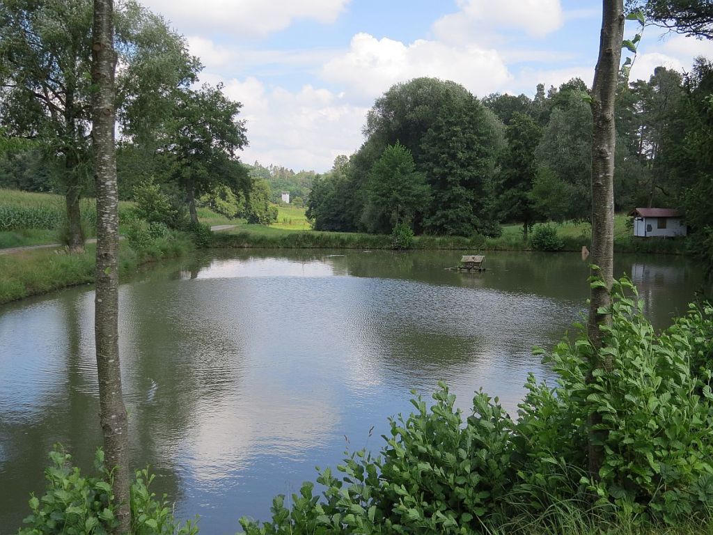 Vom Fuchsteich aus kann man den Turm auf der kleinen Anhöhe auch noch gut sehen.