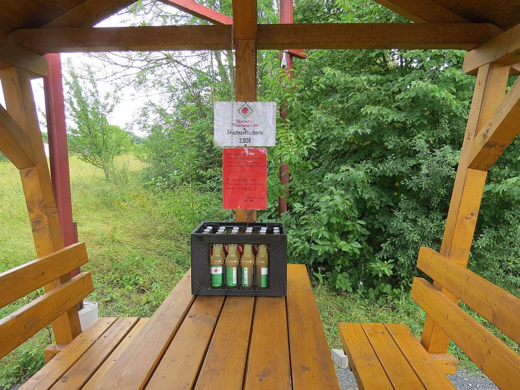 Am alten Grenzpunkt bei Adelhausen gibt es eine Mosterei, die uns Radfahrern und Wanderern auf Vertrauensbasis Getränke zur Verfügung stellt. Großes Lob und die Apfelschorle hat mir sehr gut getan.