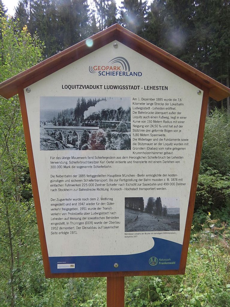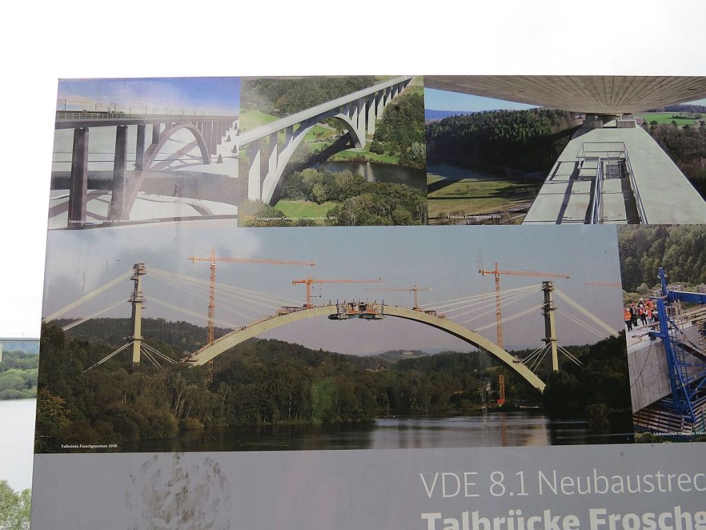 Vor dem Wald bei Weißenbrunn sieht man schon von Weitem ein Projekt der Deutschen Einheit. Hier die neue Bahnlinie Nürnberg – Berlin. Der Bogen überspannt ein großes Tal und einen Stausee mit dem schönen Namen Froschgrundsee.