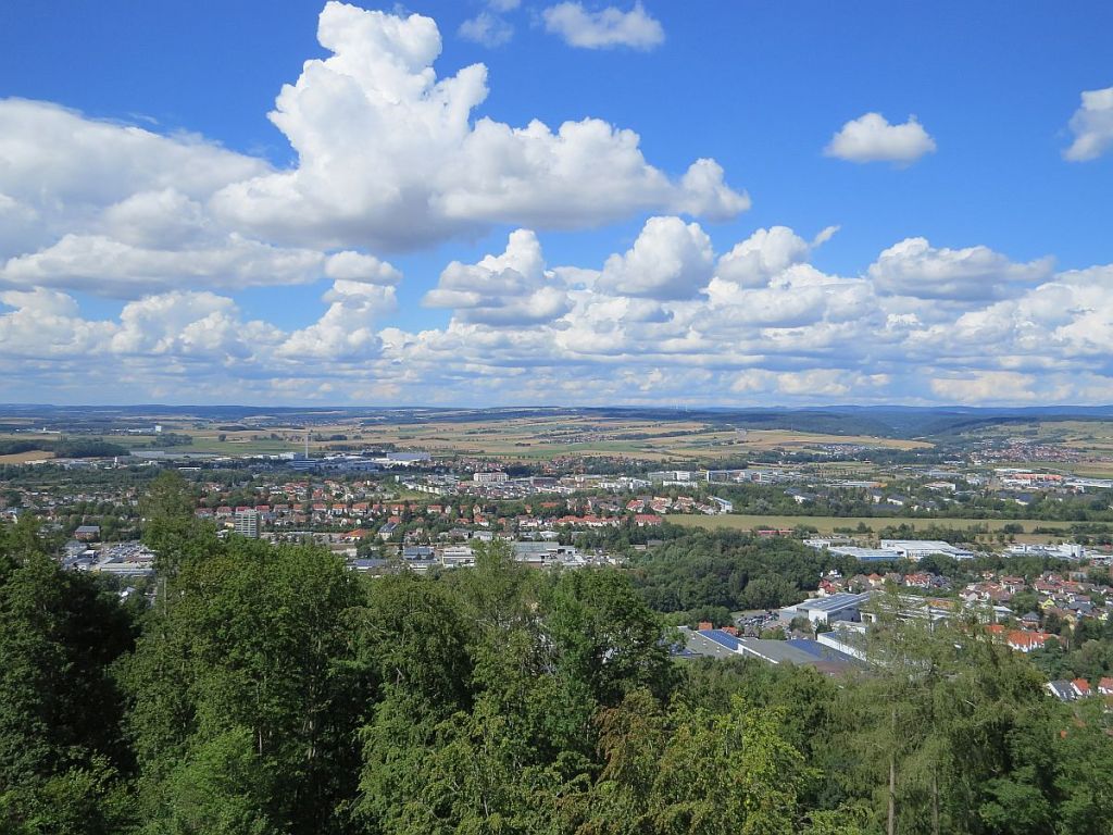 Von der Burg aus kann man in alle Himmelsrichtungen sehen. Heute war auch relativ klares Wetter und daher für Euch vier Bilder, die mehr oder weniger in Richtung Norden zeigen. Das Panorama geht immer rechts weiter. Am oberen Bildrand sind die Thüringer Berge zu sehen.