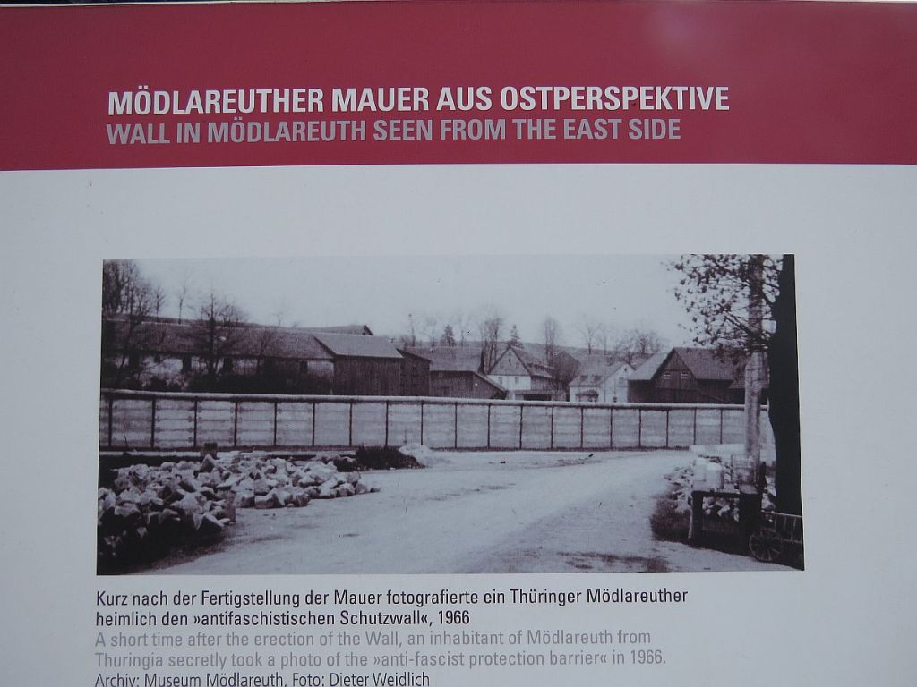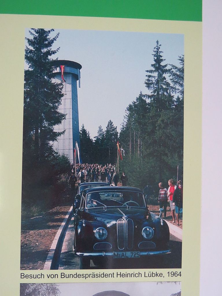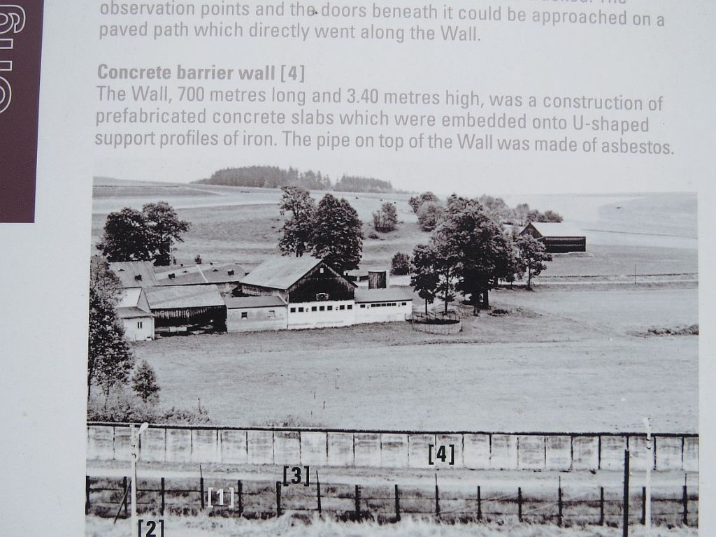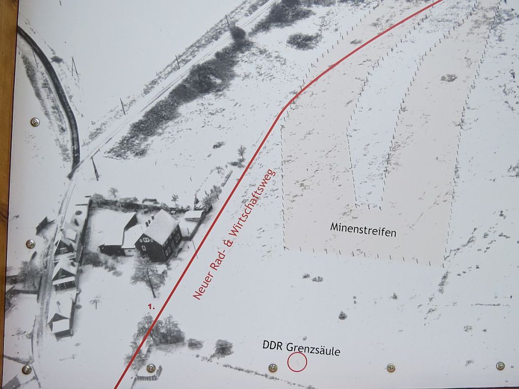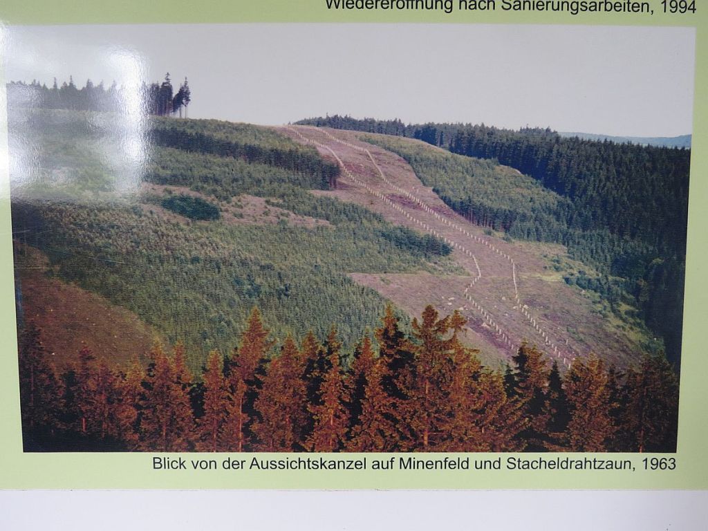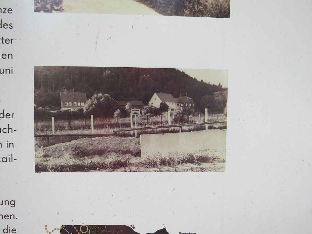 Am Informationspunkt traf ich vier Hotelgäste aus Ummerstadt, die mit dem Auto dort hingefahren sind. Hier zwei Bilder, die vom gleichen Standpunkt und mit gleicher Einstellung gemacht wurden. Diese zeigen, wie nah die Häuser dran standen. Der Beobachtungsturm des Ortes wurde abgerissen.