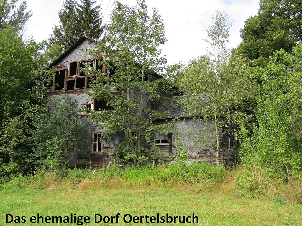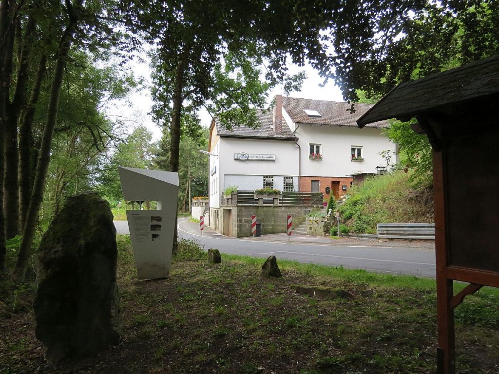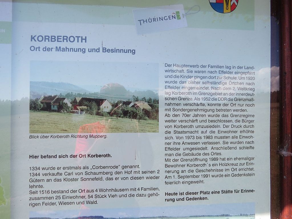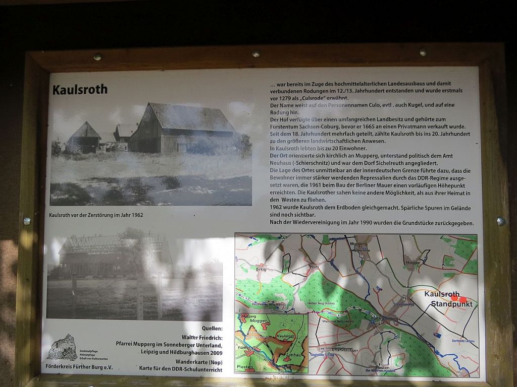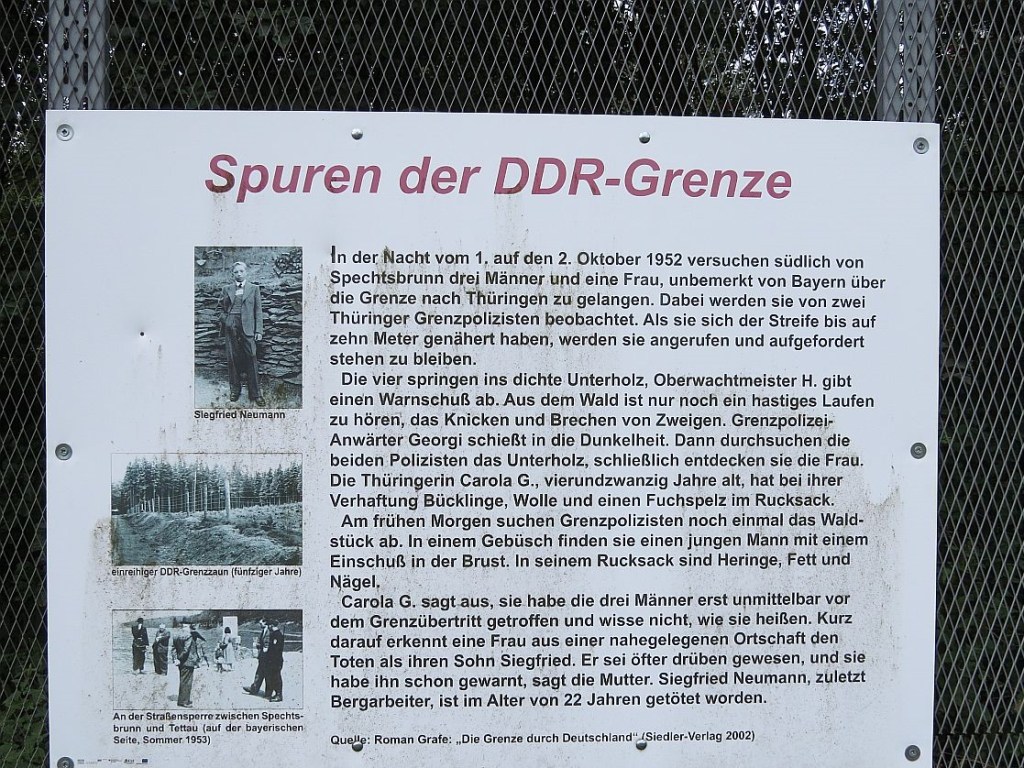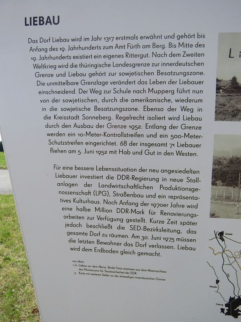 Am Informationspunkt traf ich vier Hotelgäste aus Ummerstadt, die mit dem Auto dort hingefahren sind. Hier zwei Bilder, die vom gleichen Standpunkt und mit gleicher Einstellung gemacht wurden. Diese zeigen, wie nah die Häuser dran standen. Der Beobachtungsturm des Ortes wurde abgerissen.